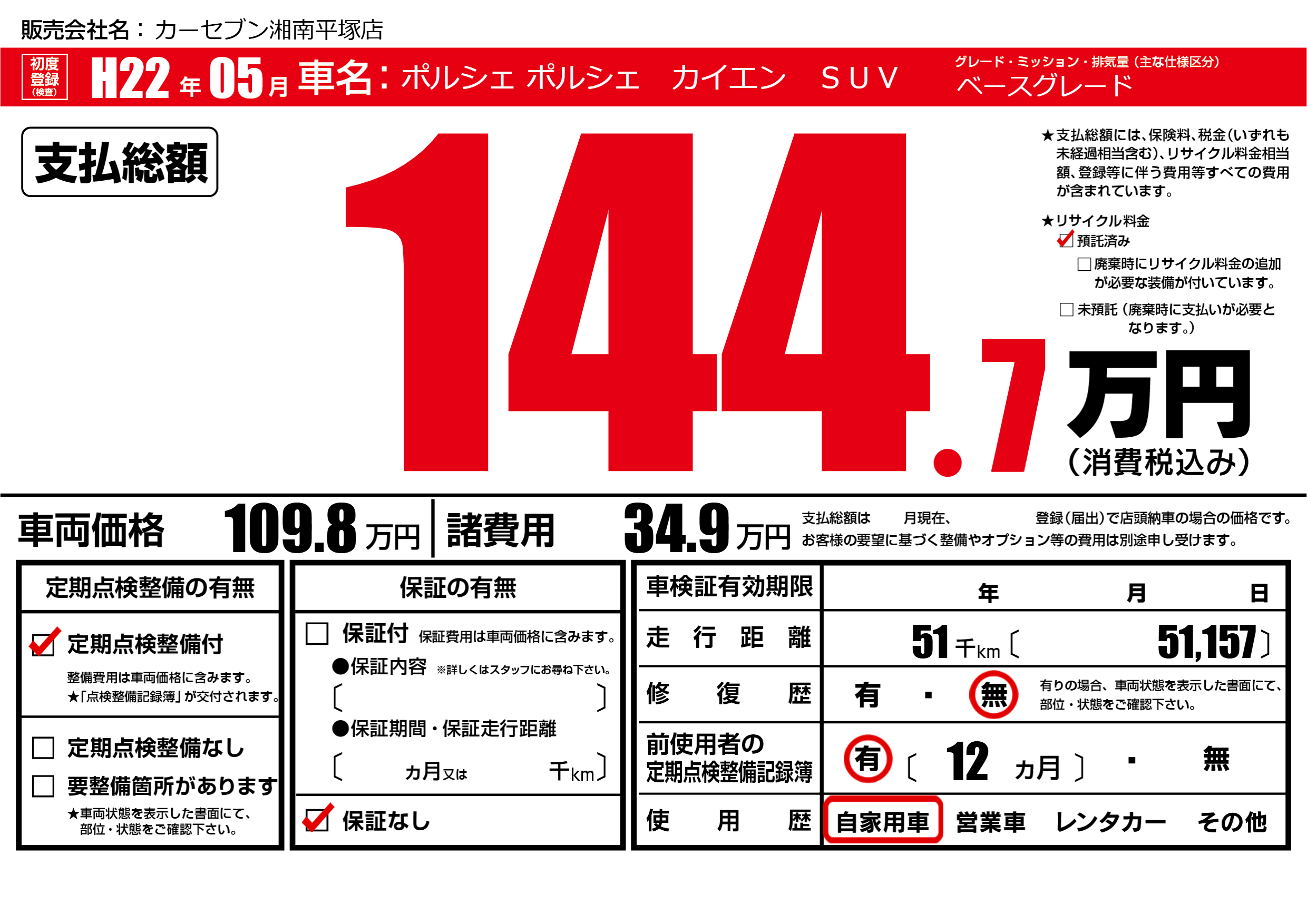 | 走行キロ | 5.1万km | 初年度登録 | H22年05月 |