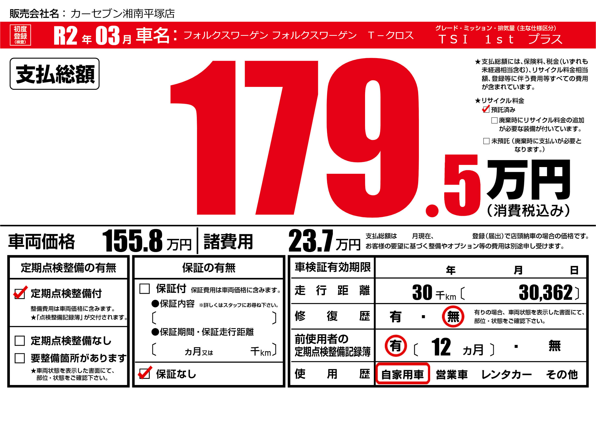 | 車名 | フォルクスワーゲン フォルクスワーゲン T-クロス | グレード ミッション 排気量 |