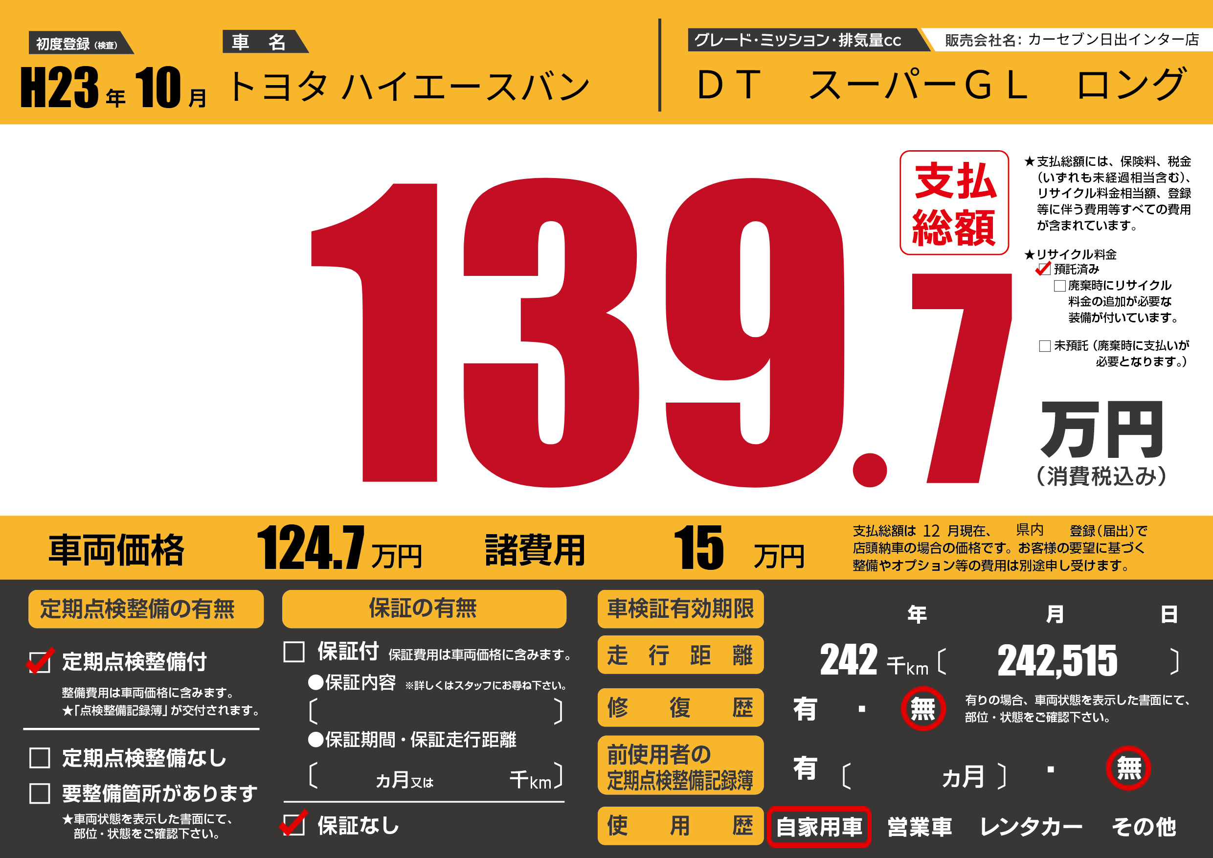 | 走行キロ | 24.2万km | 初年度登録 | H23年10月 |