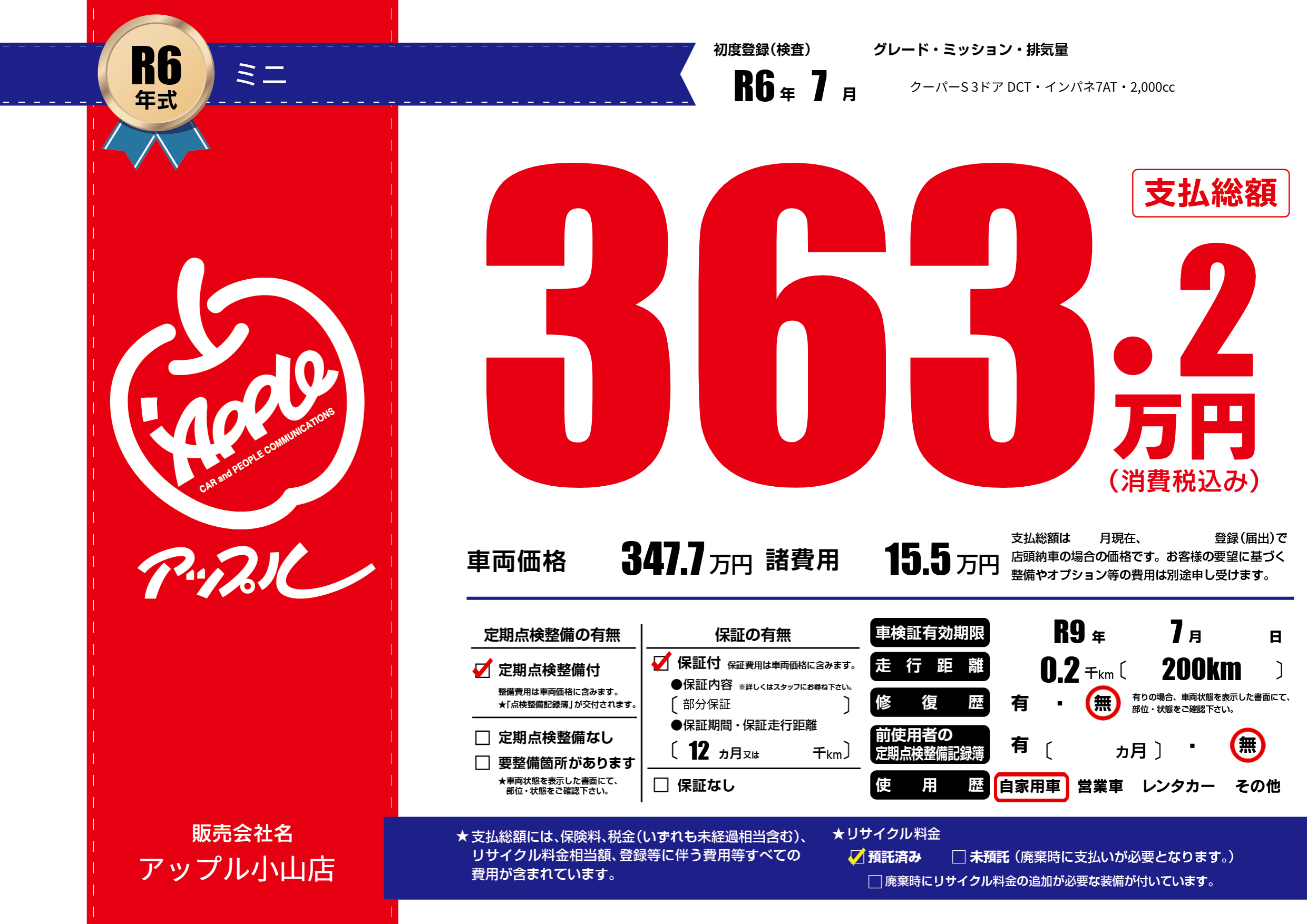 | 車検制限 | R9年 7月 - 日 | ||