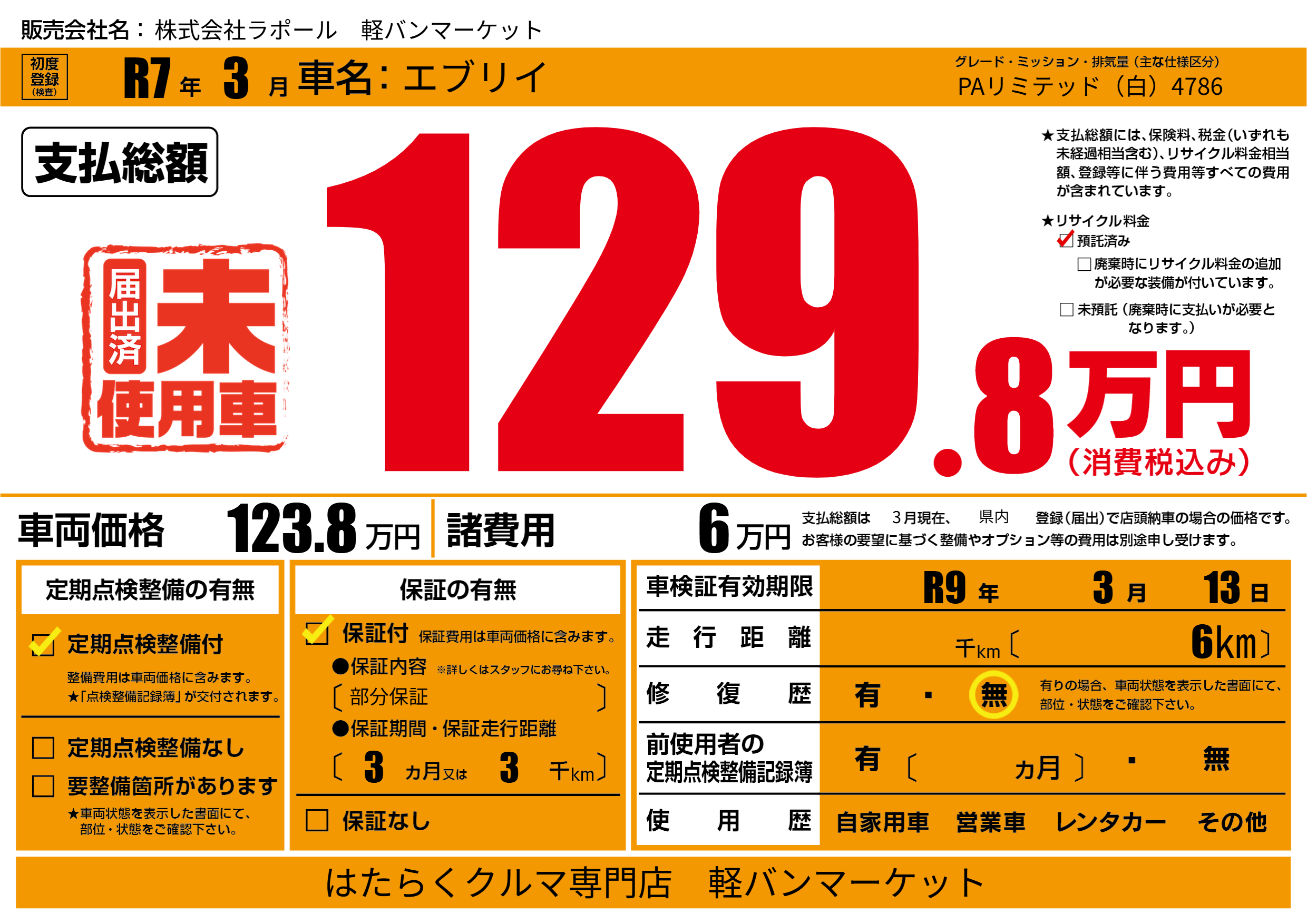 | 走行キロ | - | 初年度登録 | R7年3月 |