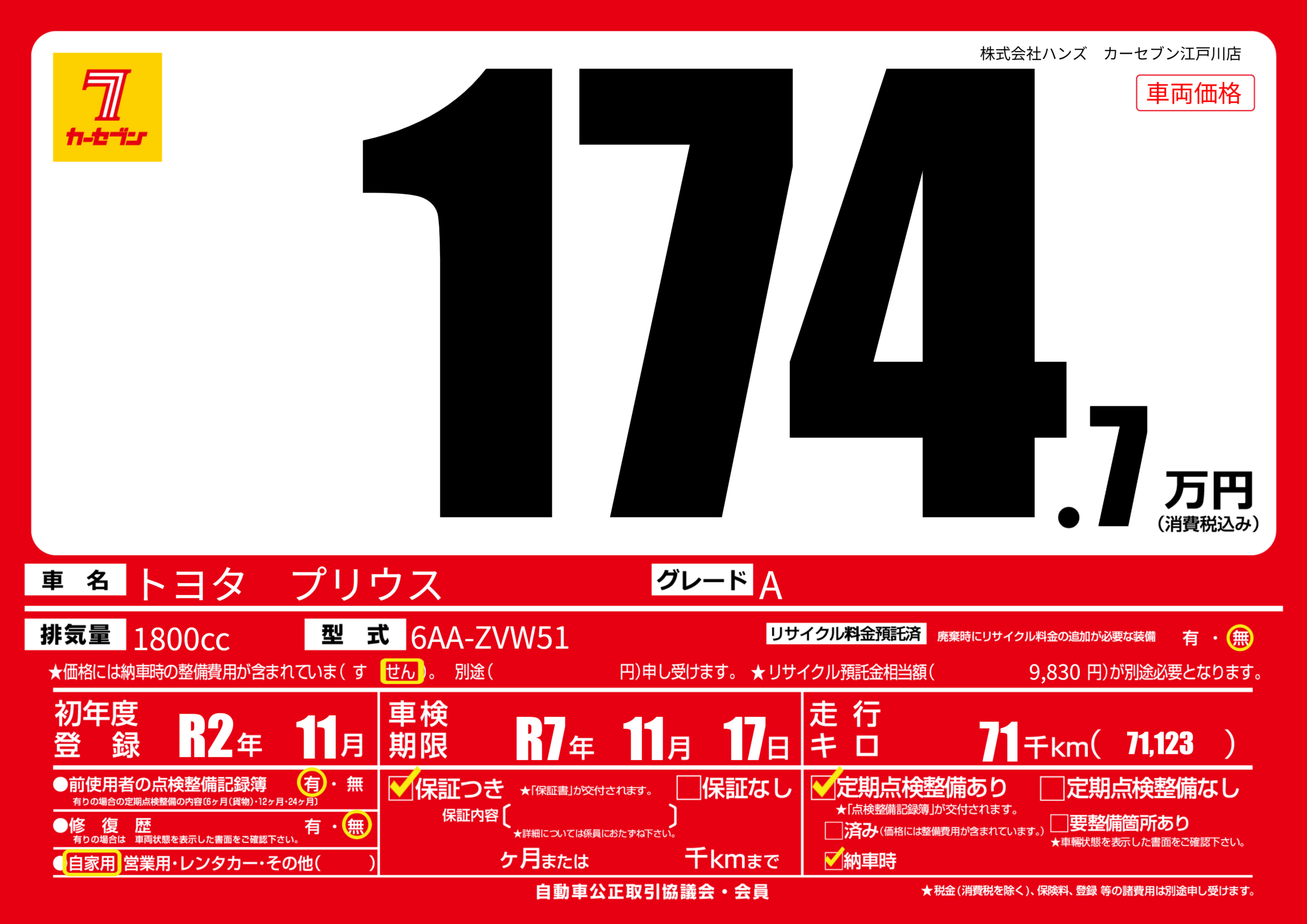 | 車名 | トヨタ プリウス | グレード ミッション 排気量 |