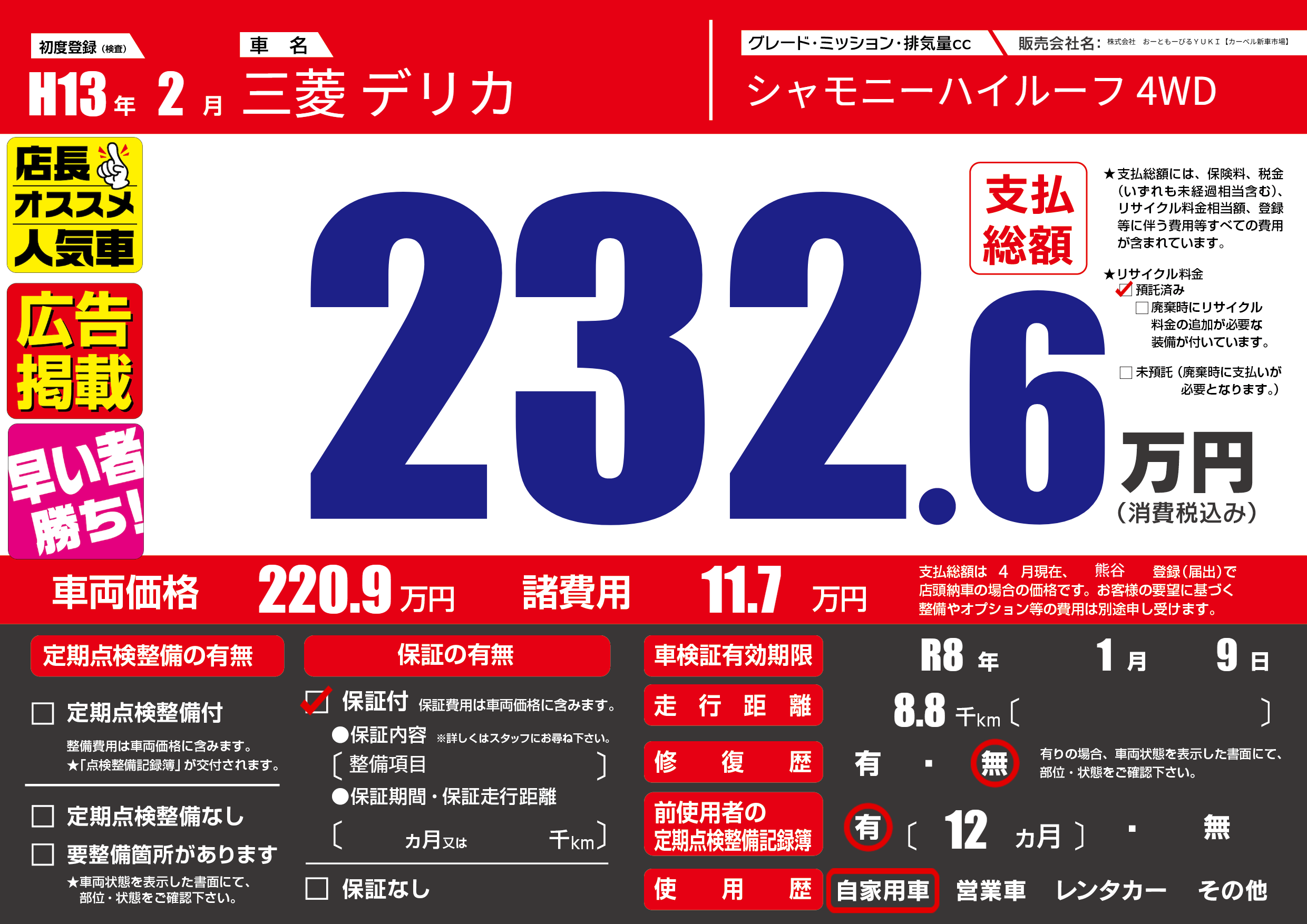 | 走行キロ | 0.8万km | 初年度登録 | H13年2月 |
