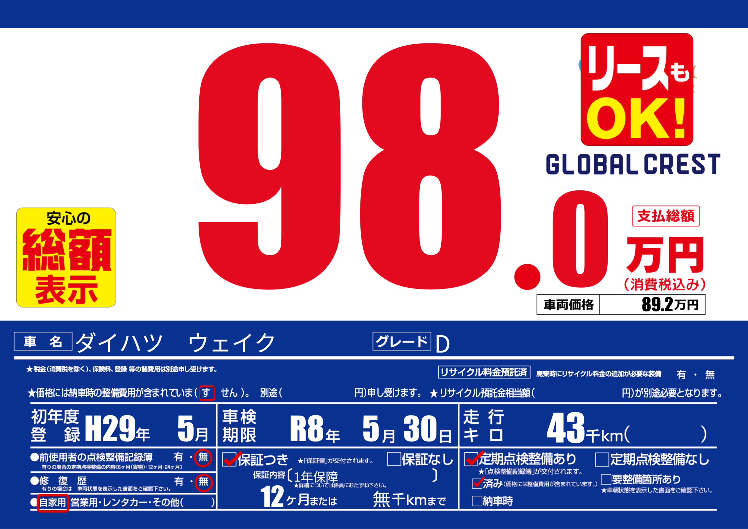 | 定期点検整備 | 定期点検整備あり 定期点検整備済み | ||