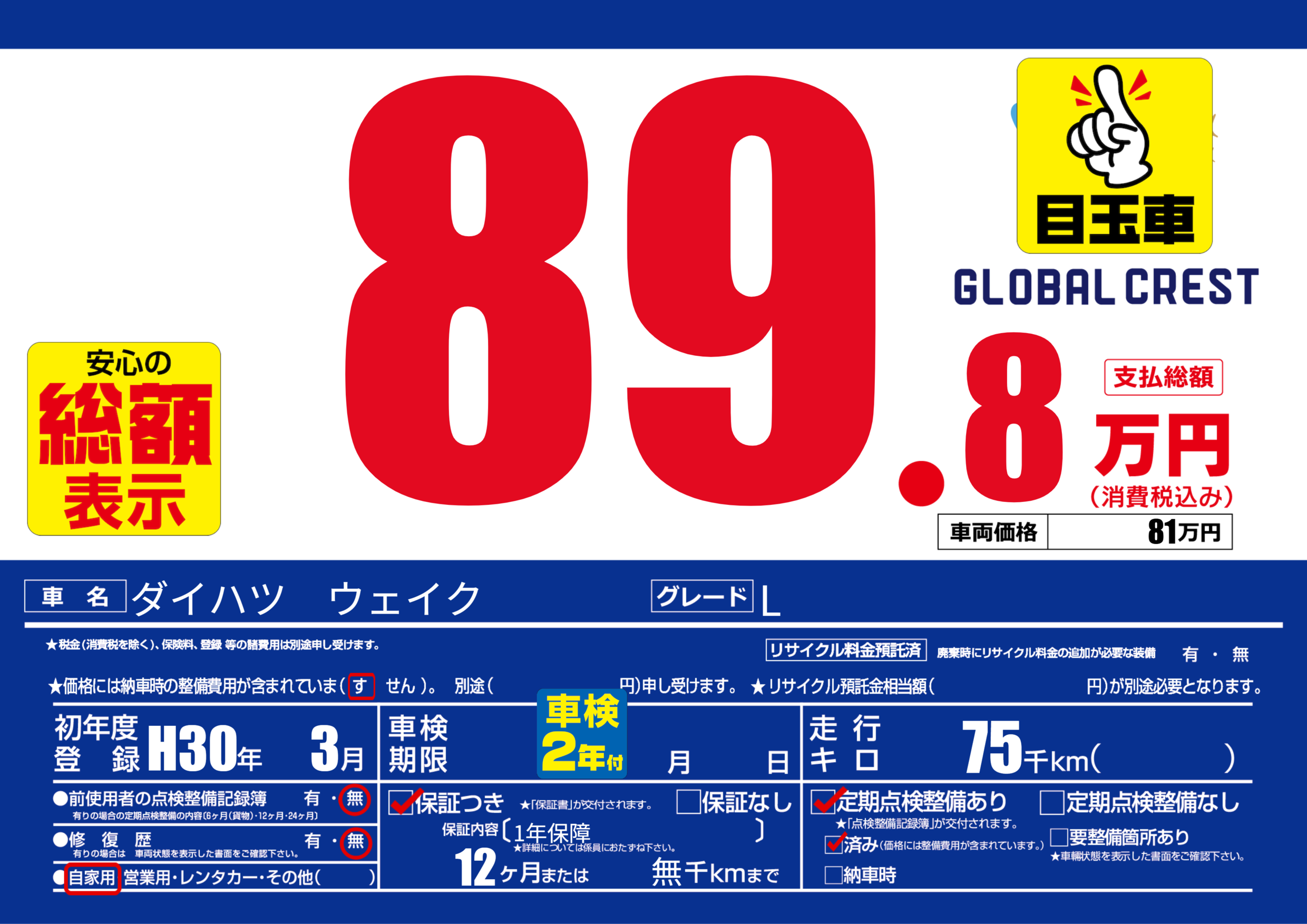 | 定期点検整備 | 定期点検整備あり 定期点検整備済み | ||
