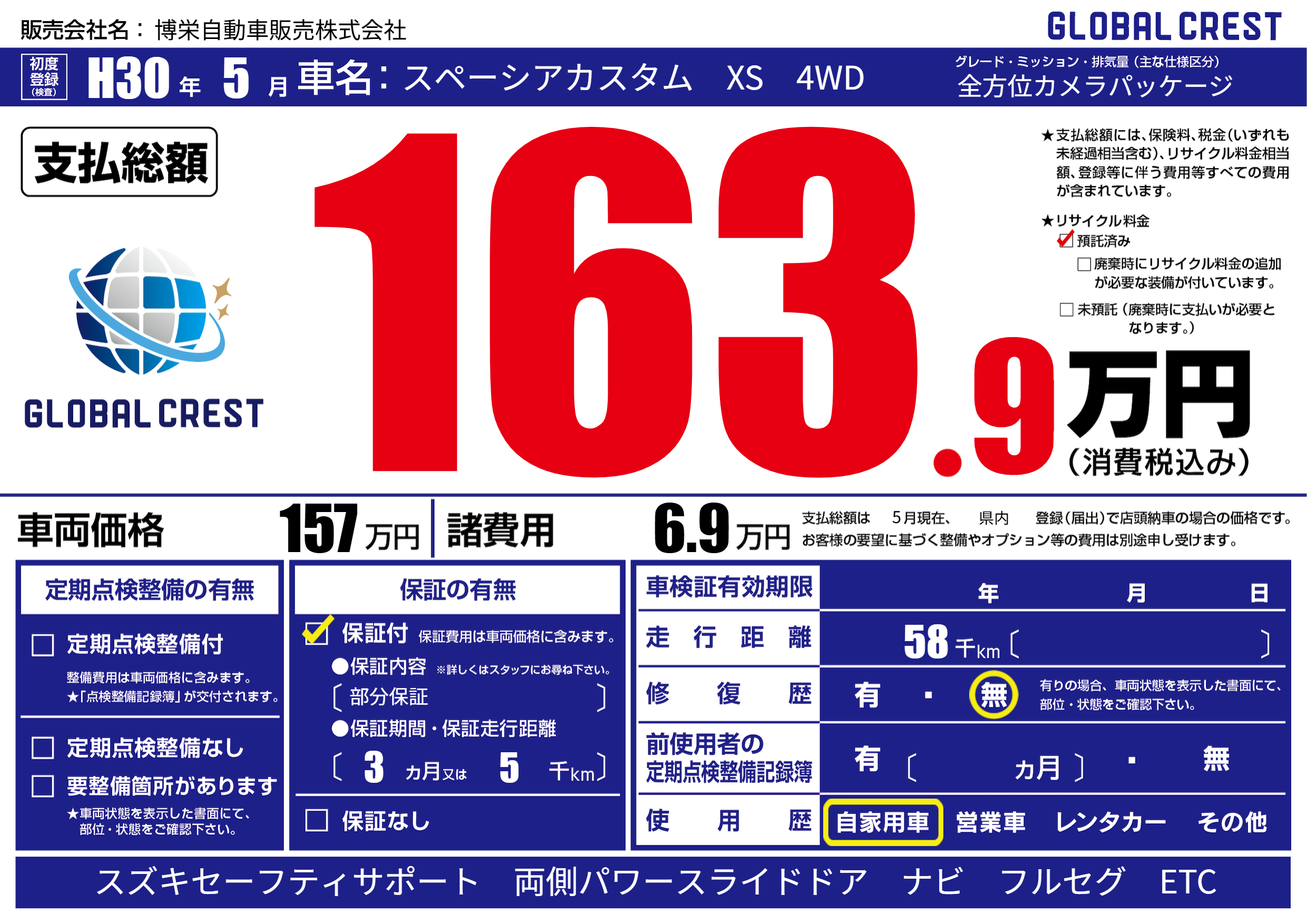 | 車名 | スペーシアカスタム XS 4WD | グレード ミッション 排気量 |