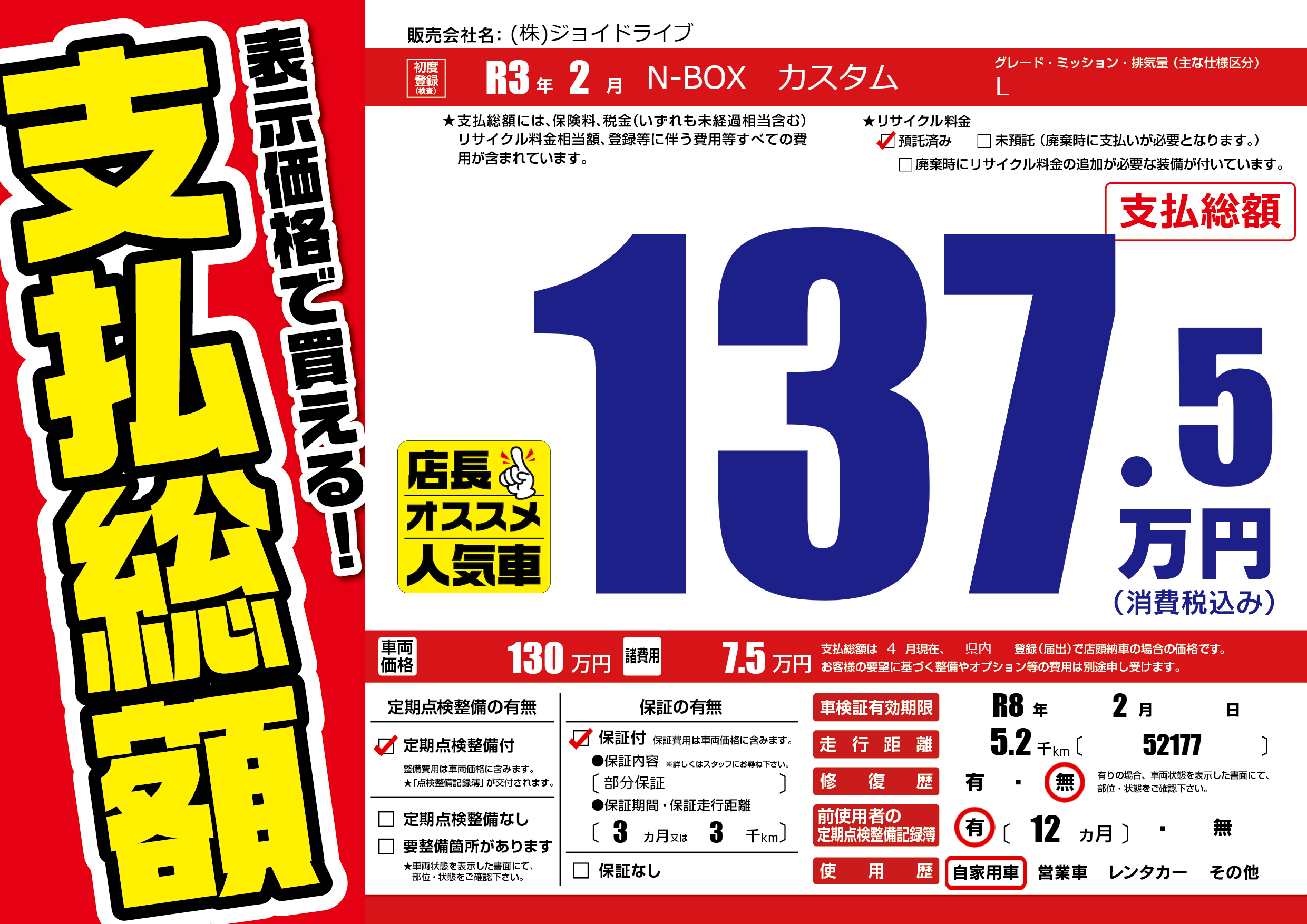 保証付き 保証内容(部分保証) 3ヶ月または(3)千kmまで |