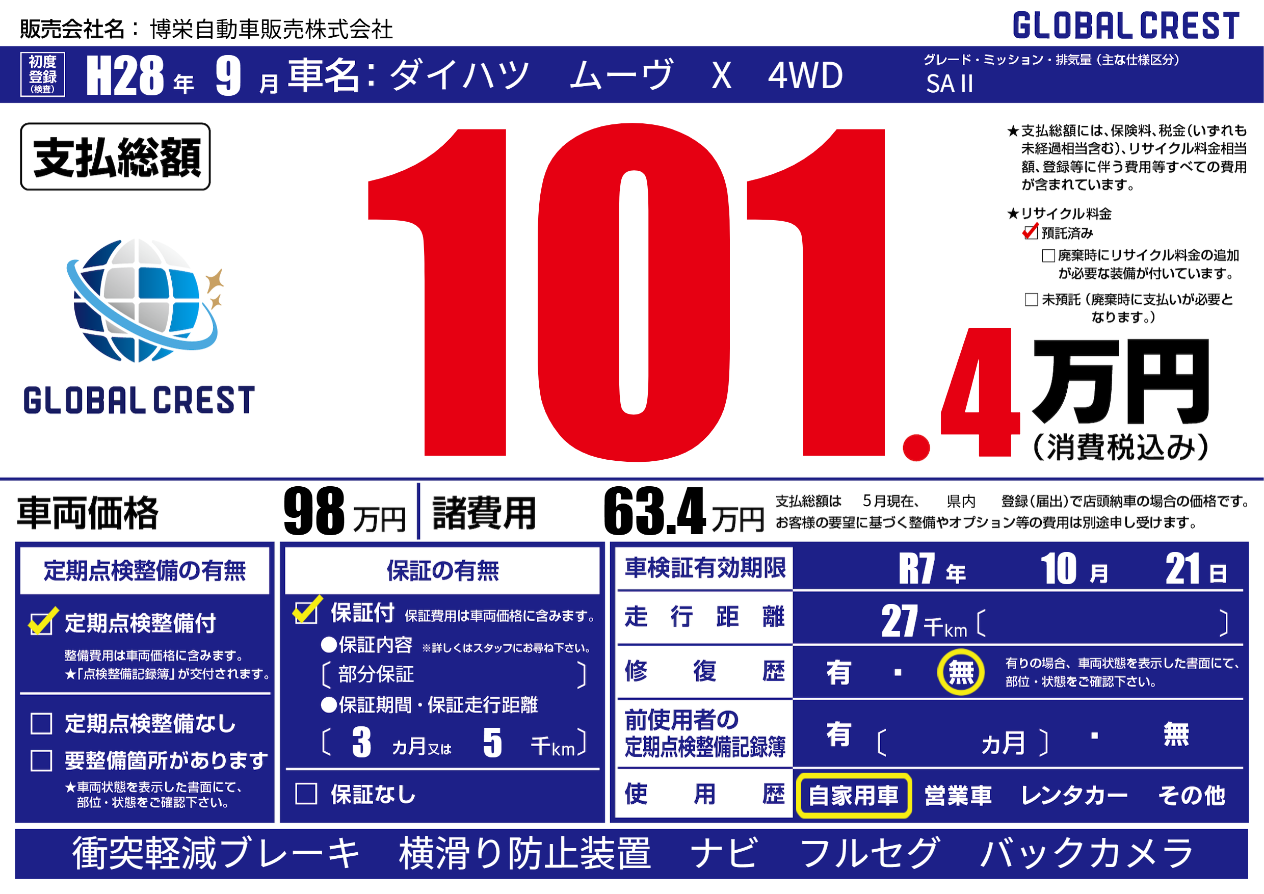 | 車名 | ダイハツ ムーヴ X 4WD | グレード ミッション 排気量 |
