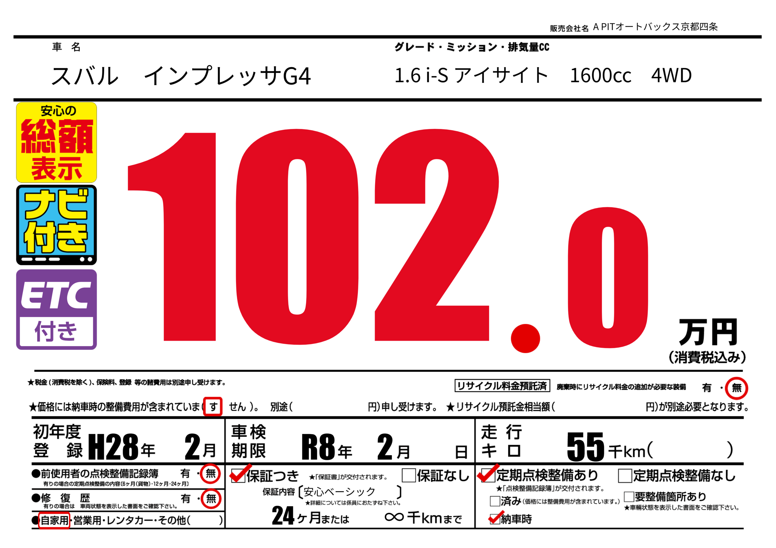 | 車名 | スバル インプレッサG4 | グレード ミッション 排気量 |