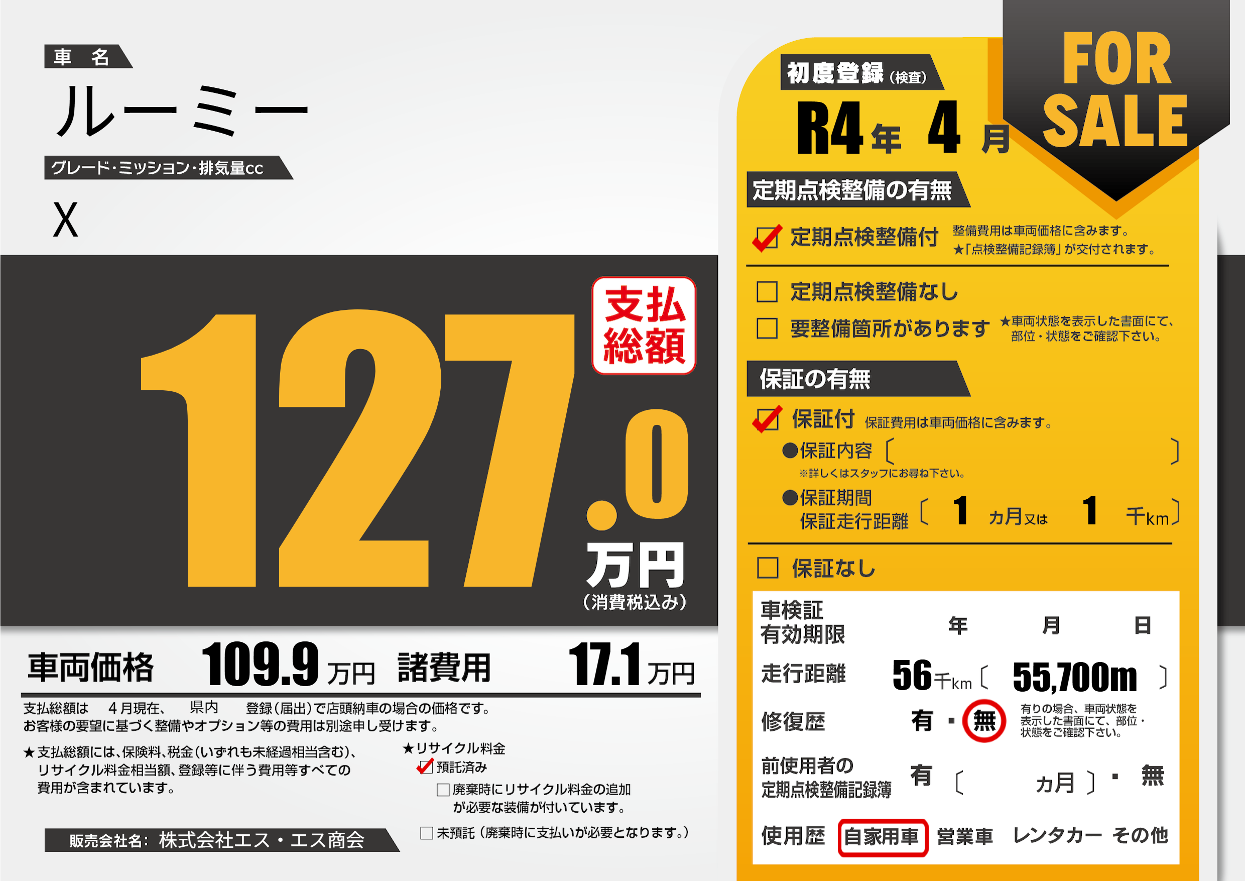 | 車名 | ルーミー | グレード ミッション 排気量 |