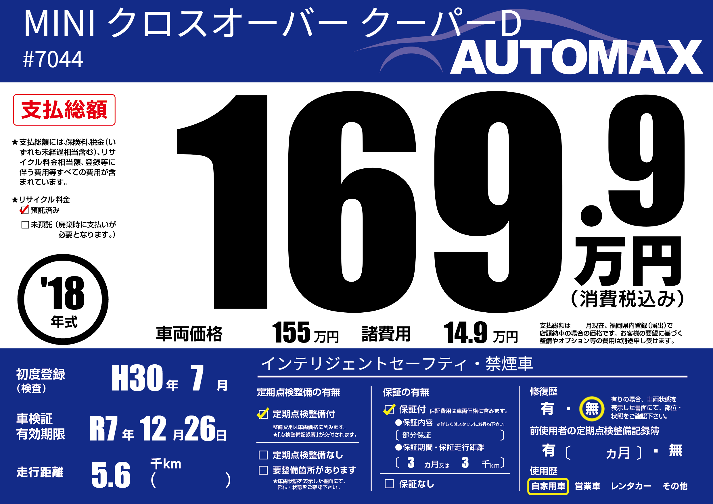 | 車名 | MINI クロスオーバー クーパーD | グレード ミッション 排気量 |