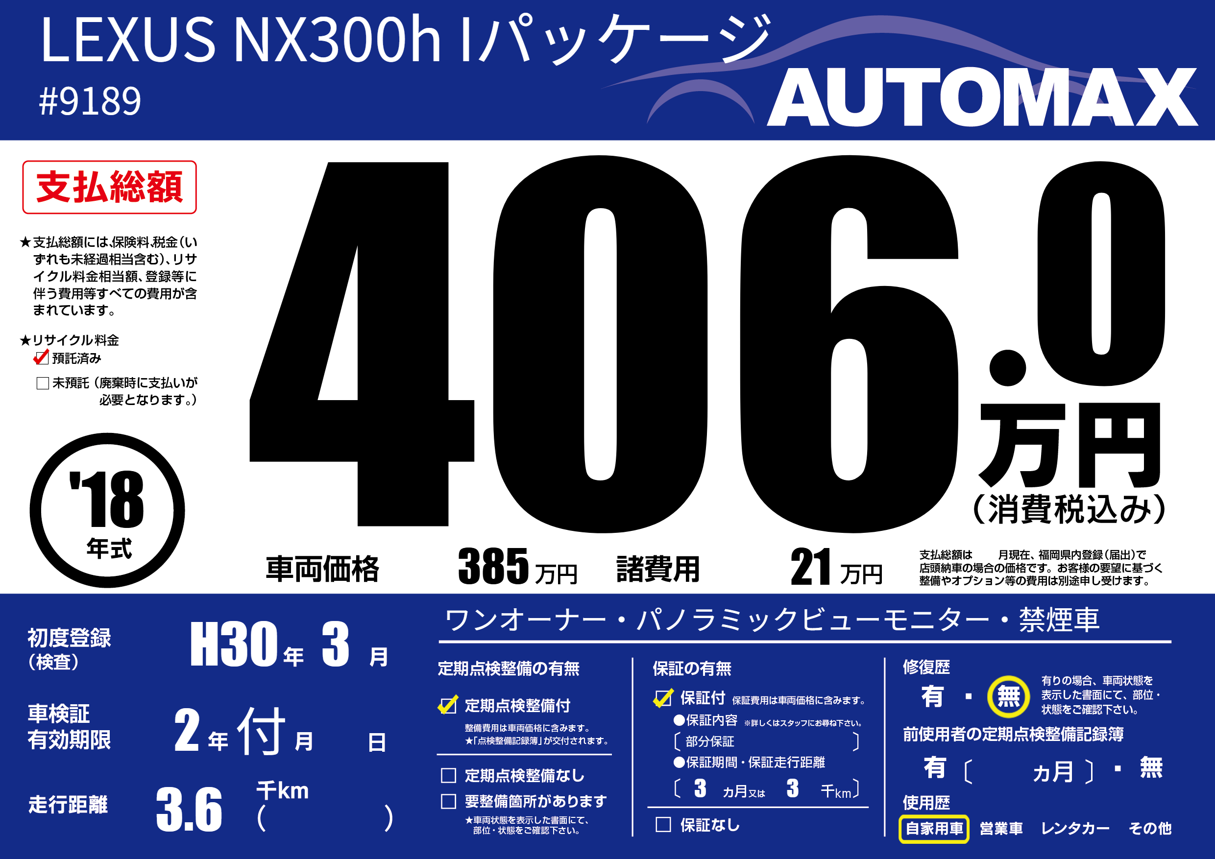 | 車名 | LEXUS NX300h Iパッケージ | グレード ミッション 排気量 |