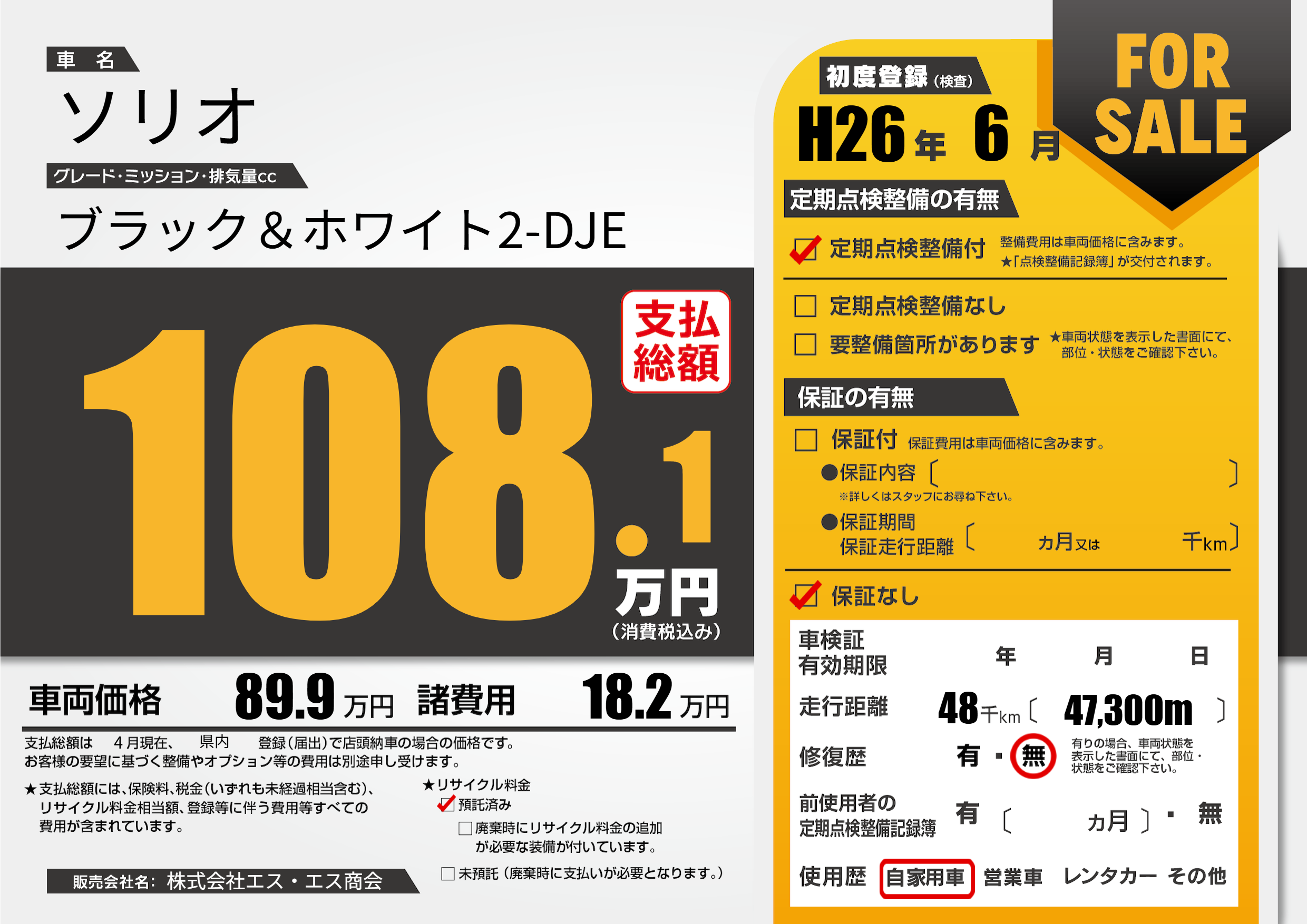 | 車名 | ソリオ | グレード ミッション 排気量 |
