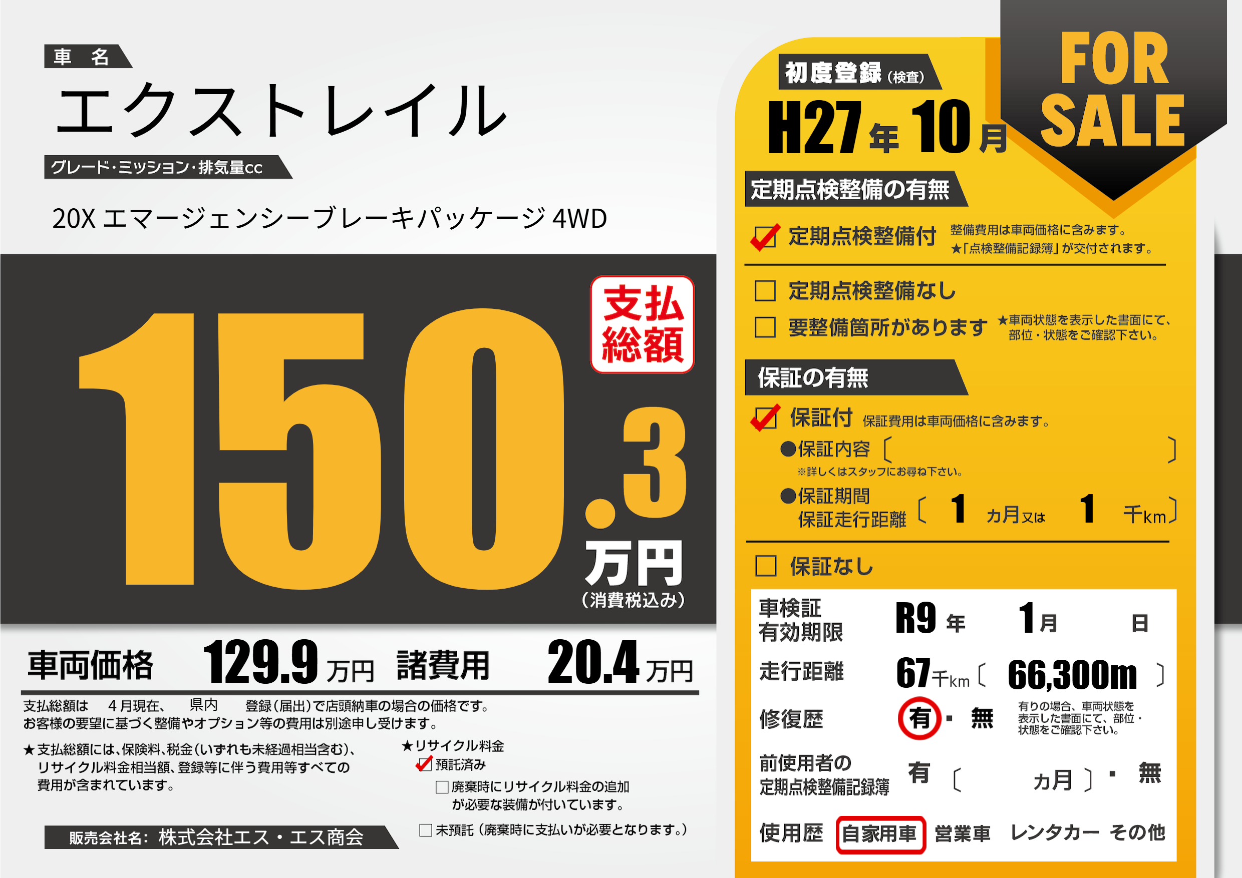 | 走行キロ | 6.7万km | 初年度登録 | H27年10月 |