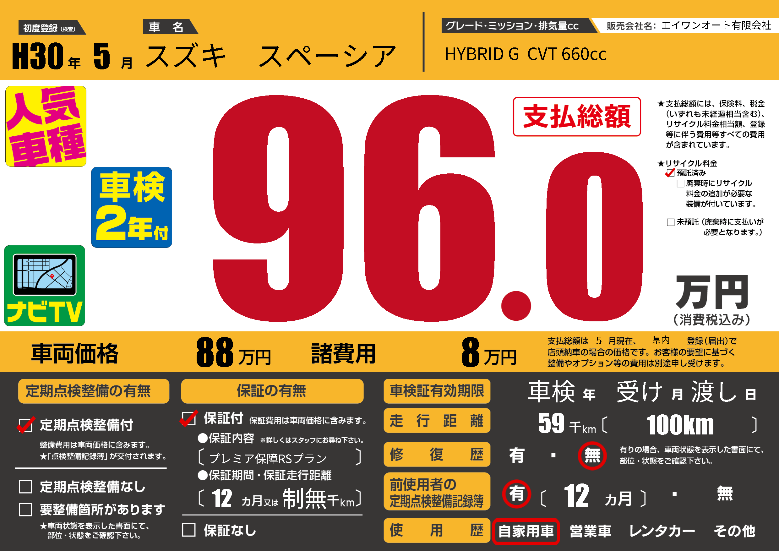 保証付き 保証内容(プレミア保障RSプラン) 12ヶ月または制無千km |