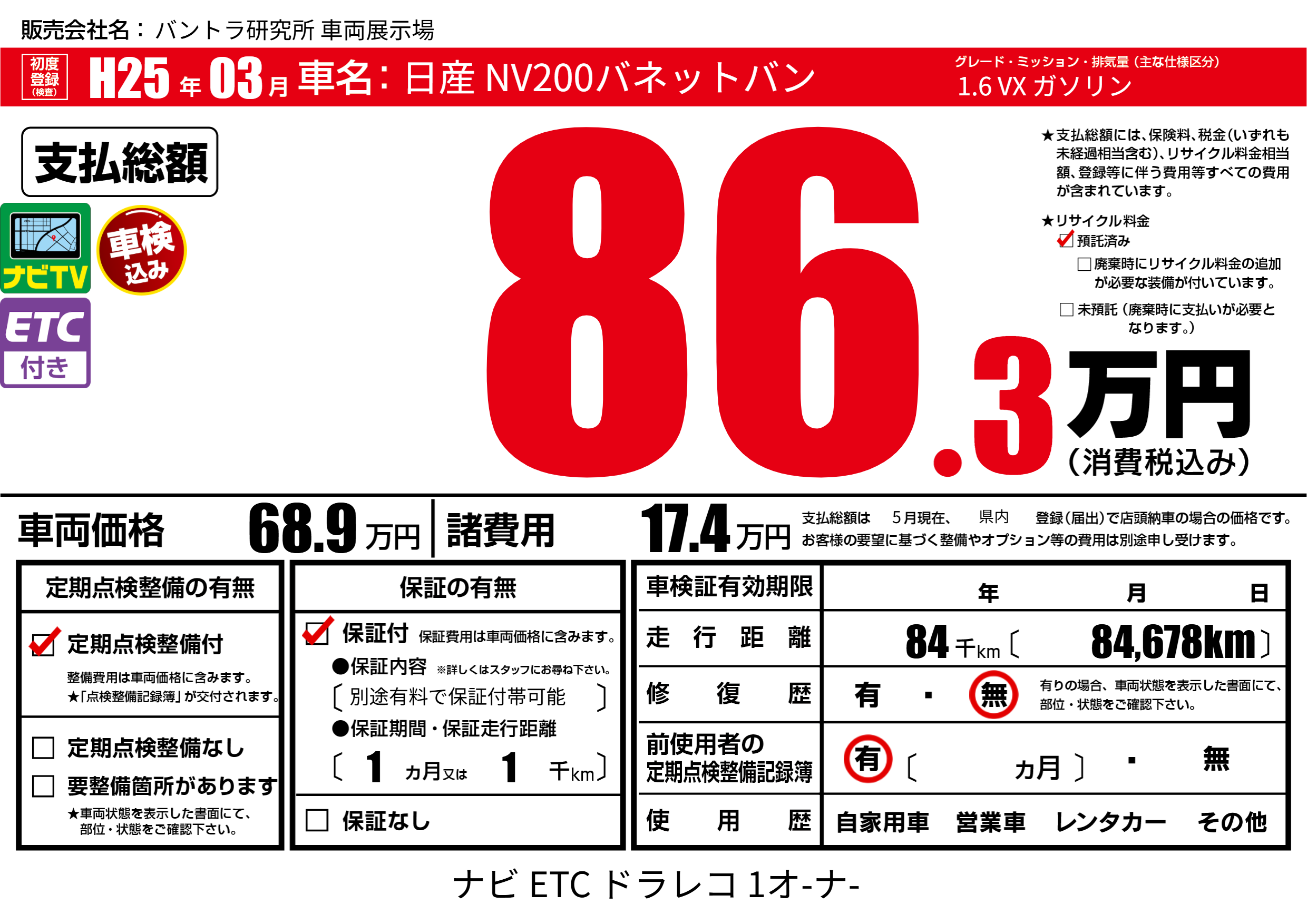 | 車名 | 日産 NV200バネットバン | グレード ミッション 排気量 |