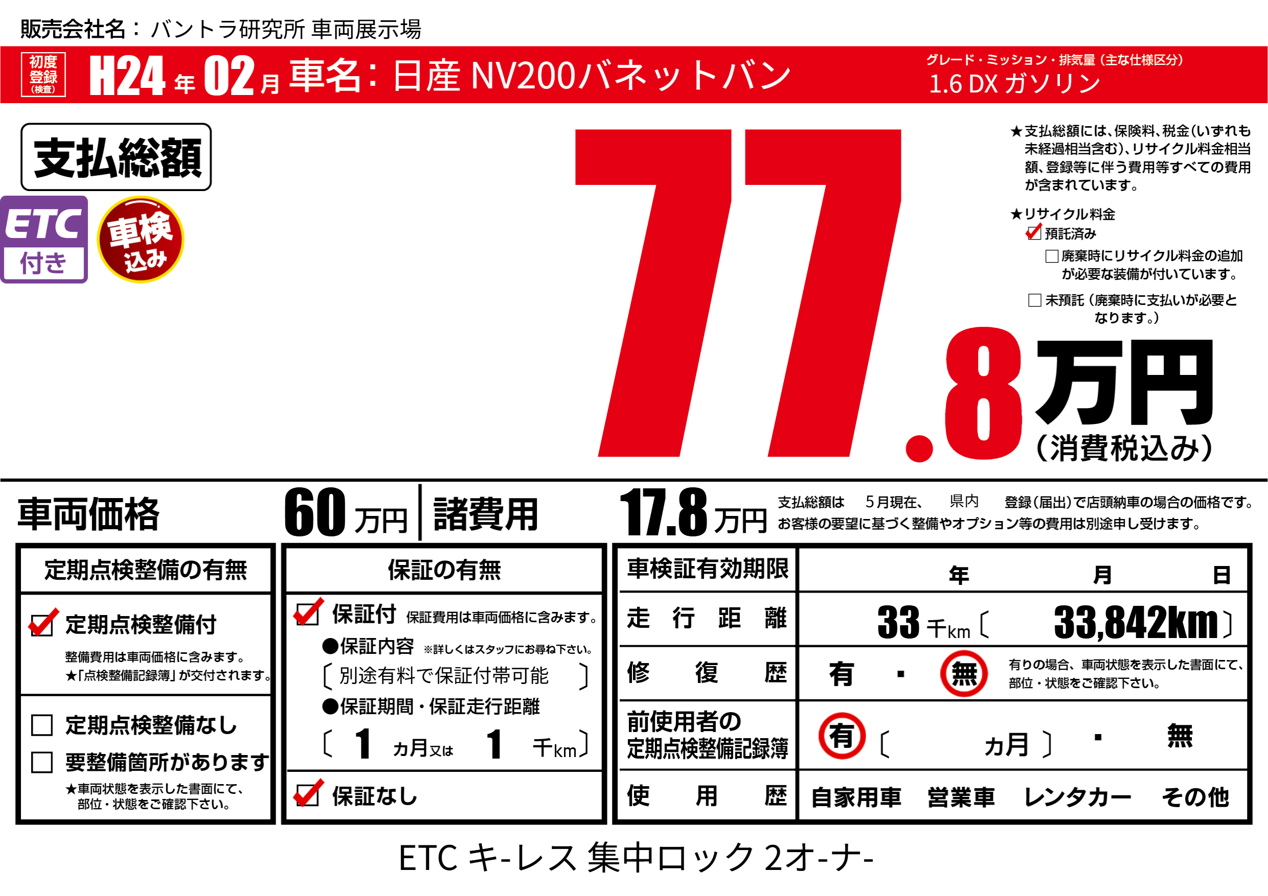 | 車名 | 日産 NV200バネットバン | グレード ミッション 排気量 |