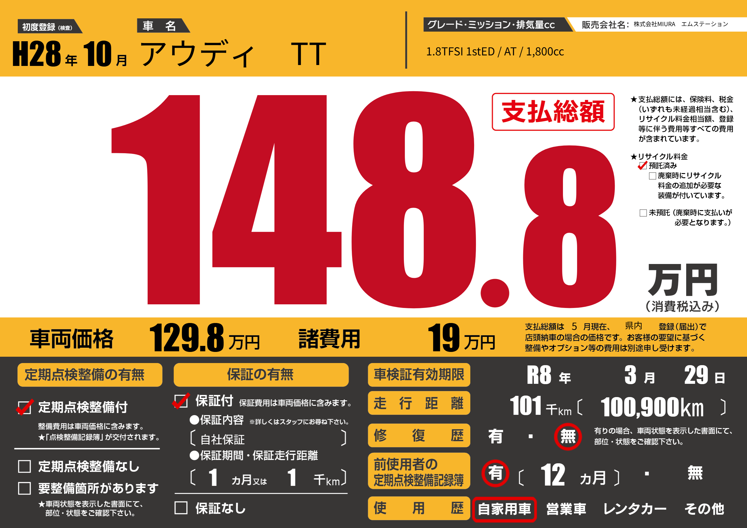 | 車名 | アウディ TT | グレード ミッション 排気量 |