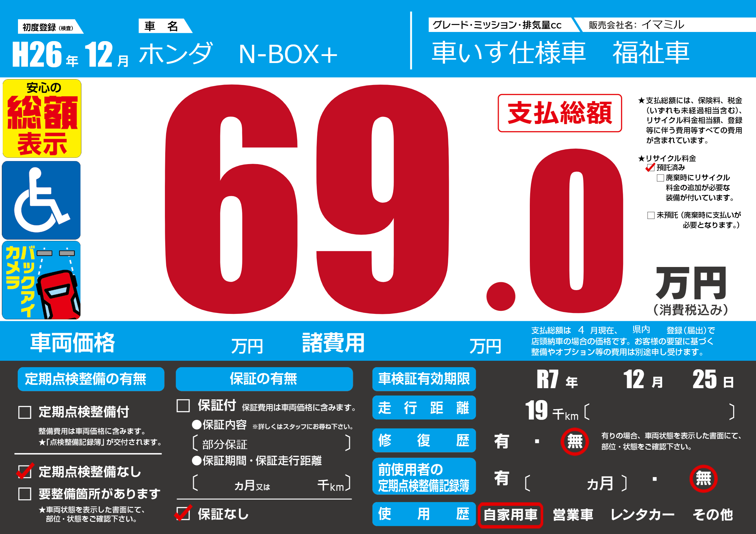 | 走行キロ | 1.9万km | 初年度登録 | H26年12月 |