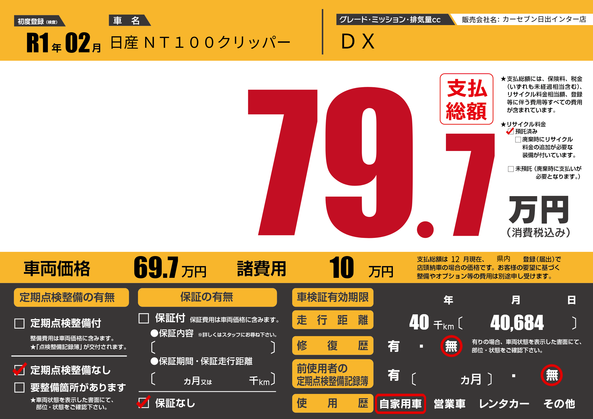 | 車名 | 日産 NT100クリッパー | グレード ミッション 排気量 |