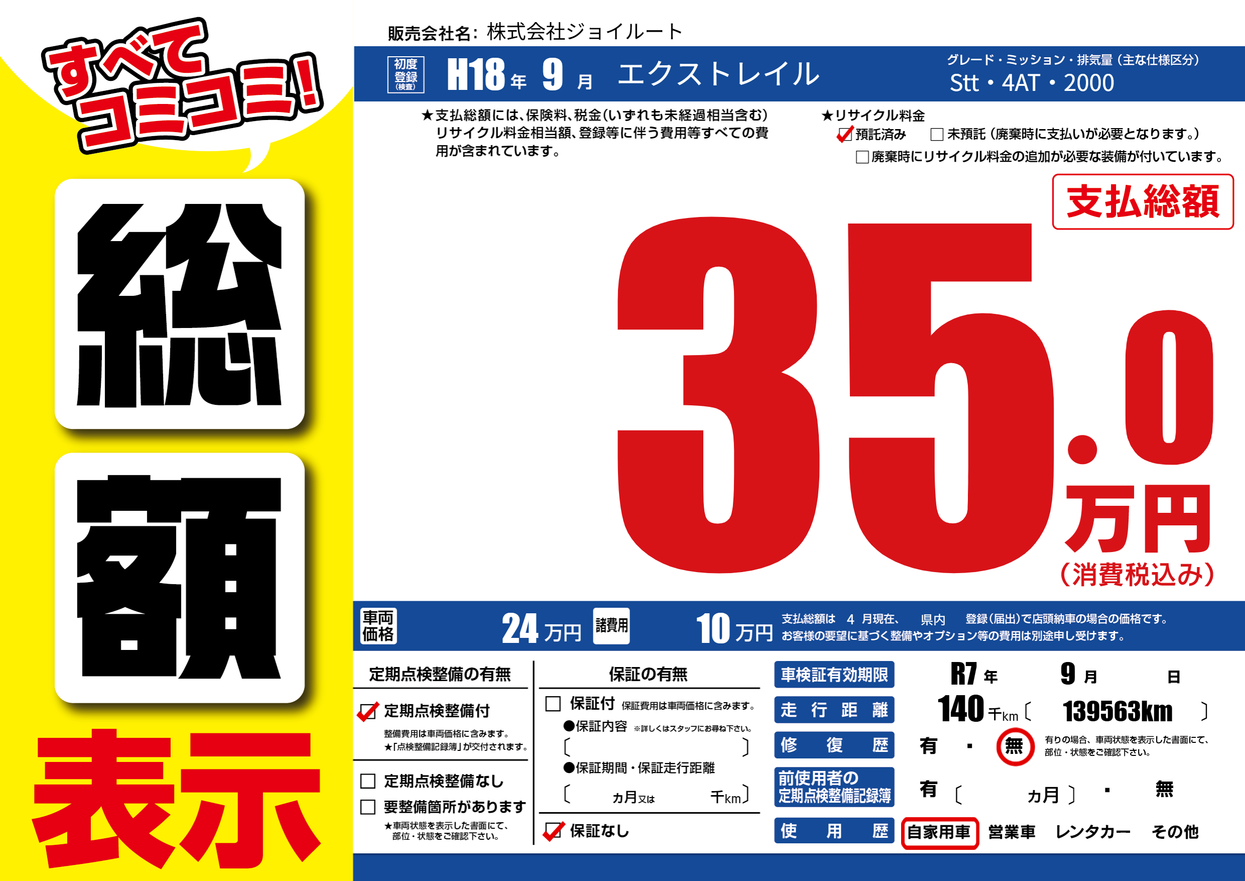 | 車検制限 | R7年 9月 - 日 | ||