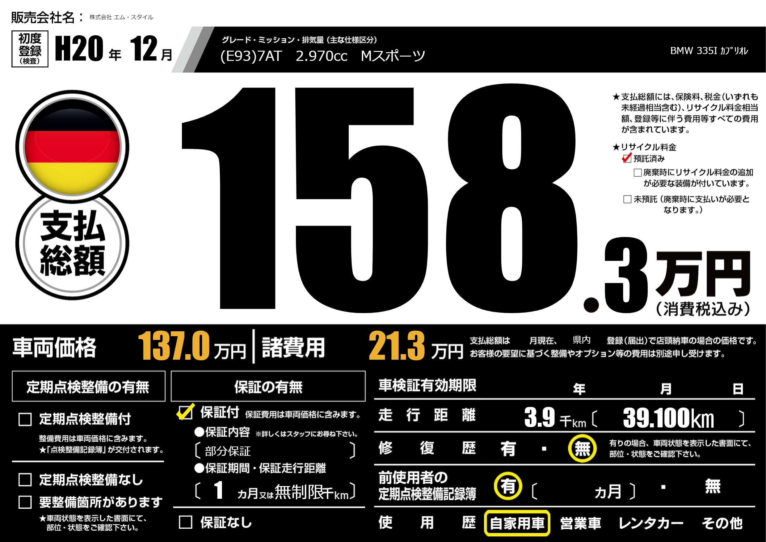 (E93)7AT 2.970cc Mスポーツ |