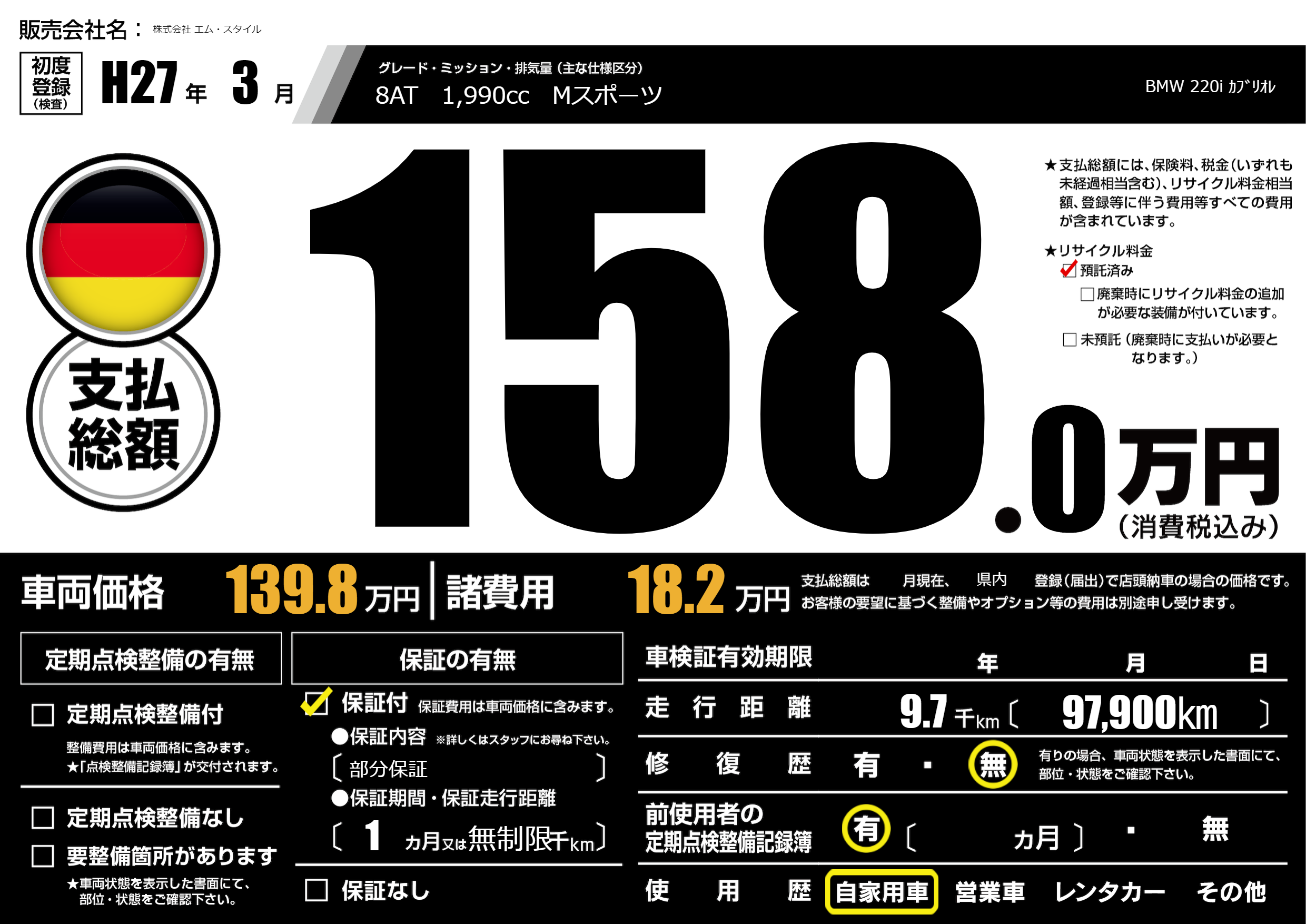 | 車名 | BMW 220i カブリオレ | グレード ミッション 排気量 |