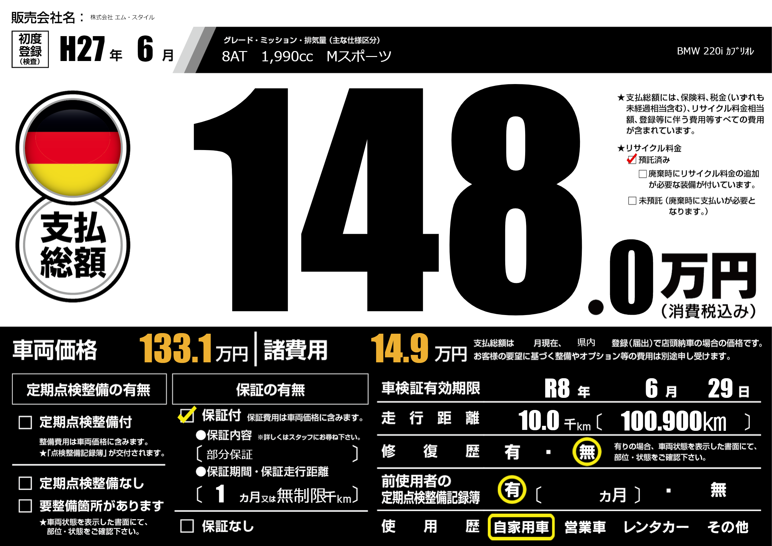 | 車名 | BMW 220i カブリオレ | グレード ミッション 排気量 |