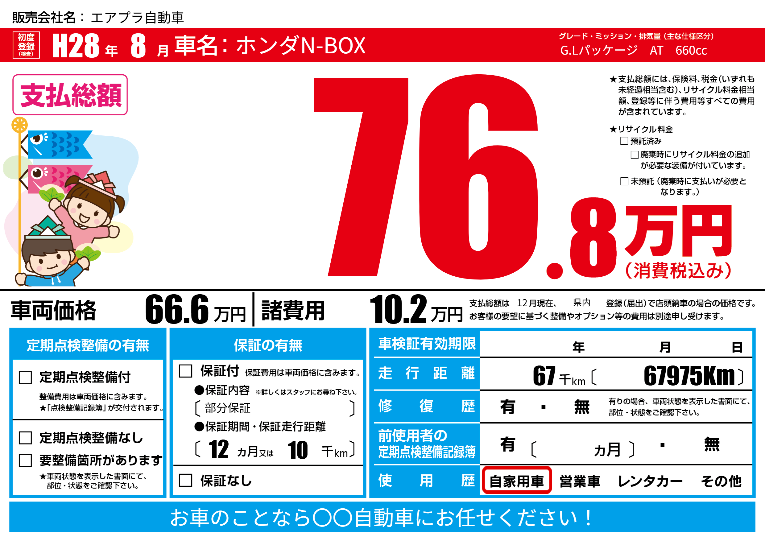 | 車名 | ホンダN-BOX | グレード ミッション 排気量 |