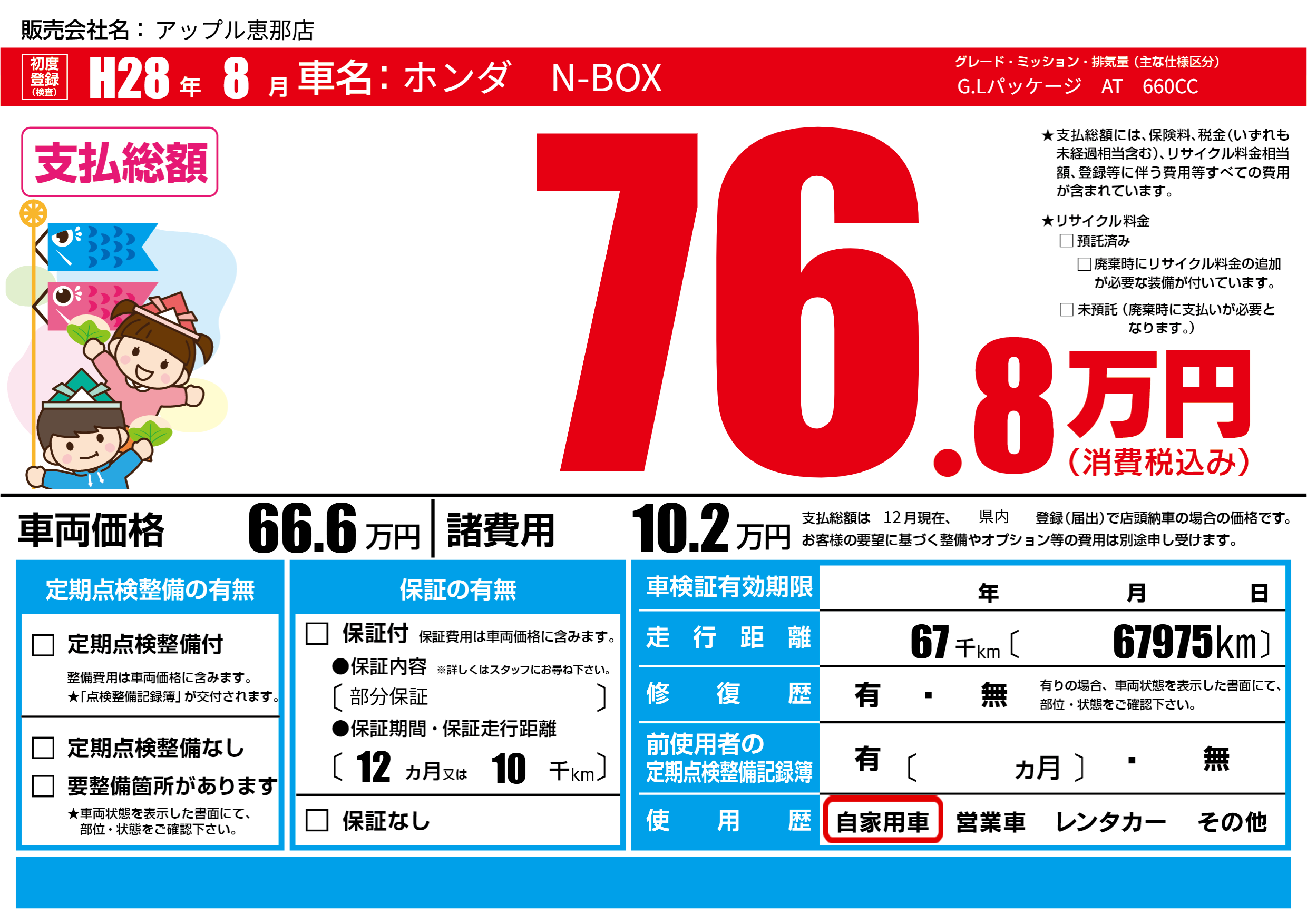 | 車名 | ホンダ N-BOX | グレード ミッション 排気量 |