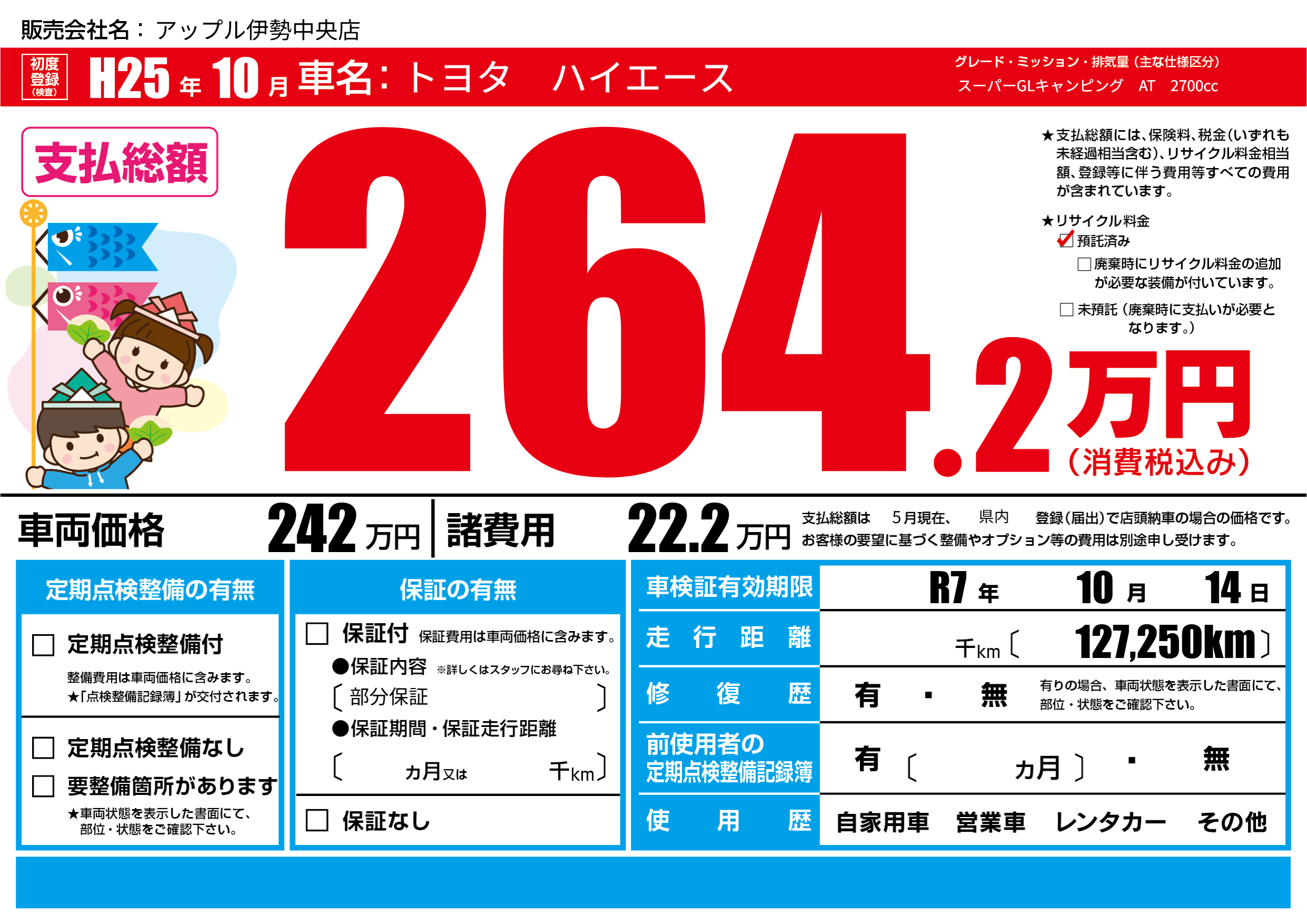 | 車名 | トヨタ ハイエース | グレード ミッション 排気量 |