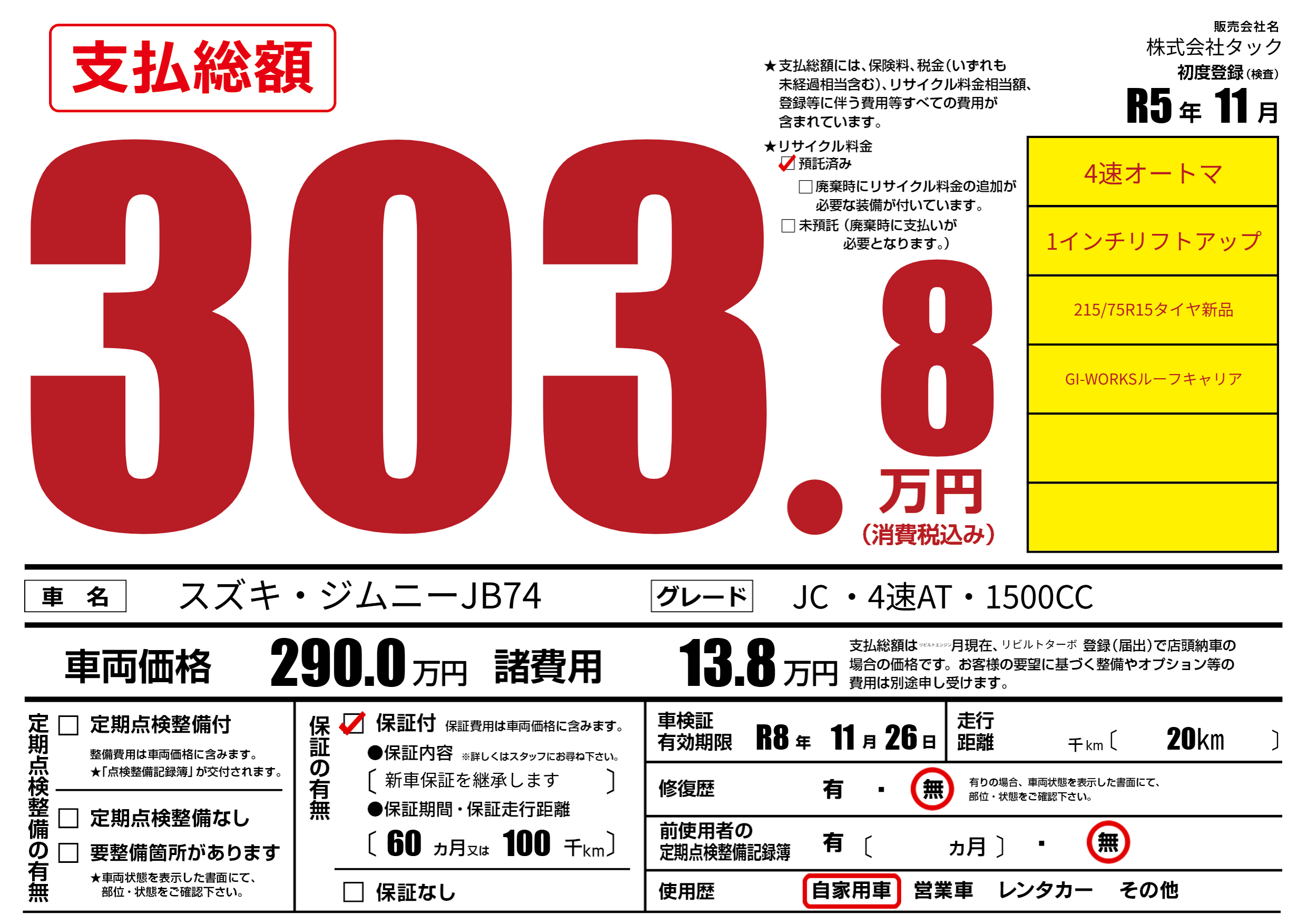 | 車名 | スズキ・ジムニーJB74 | グレード ミッション 排気量 |