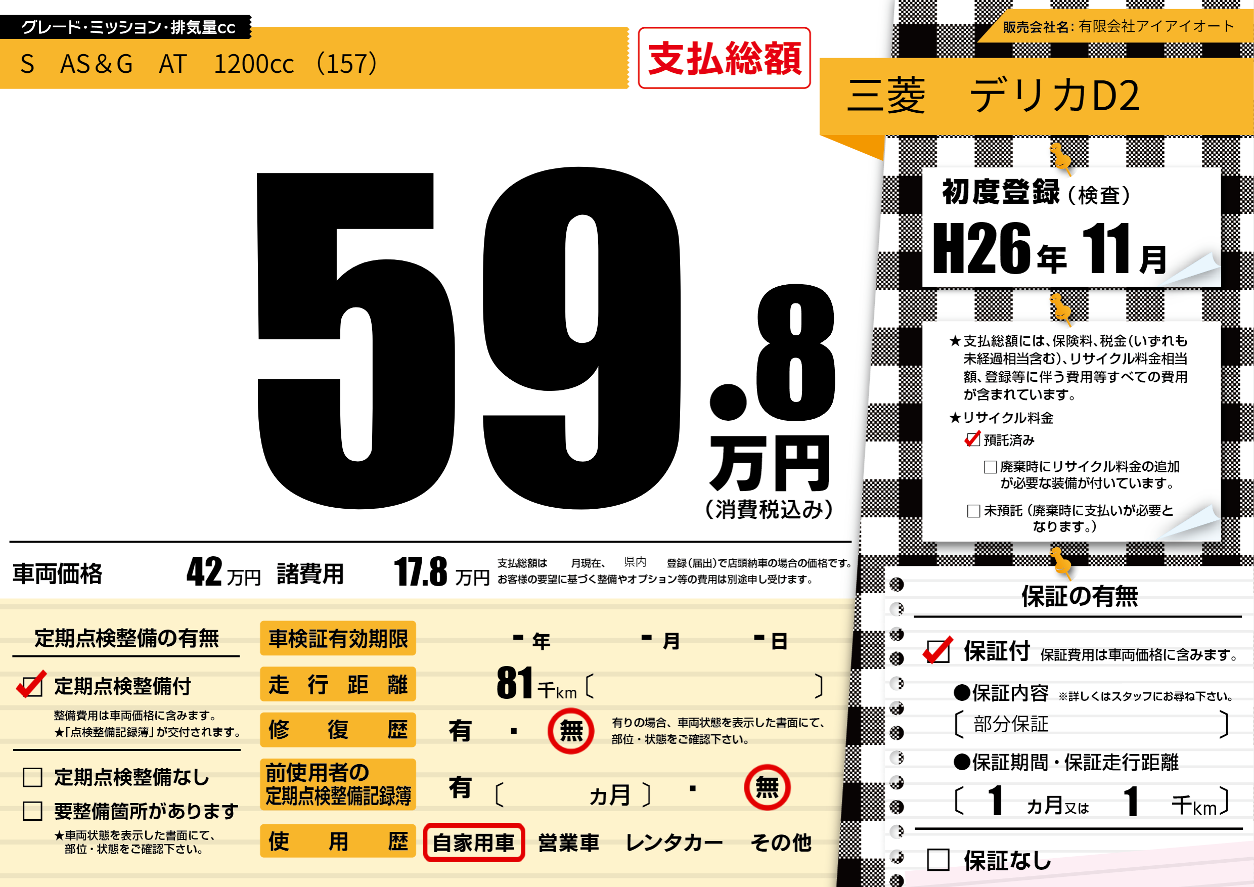 | 車名 | 三菱 デリカD2 | グレード ミッション 排気量 |