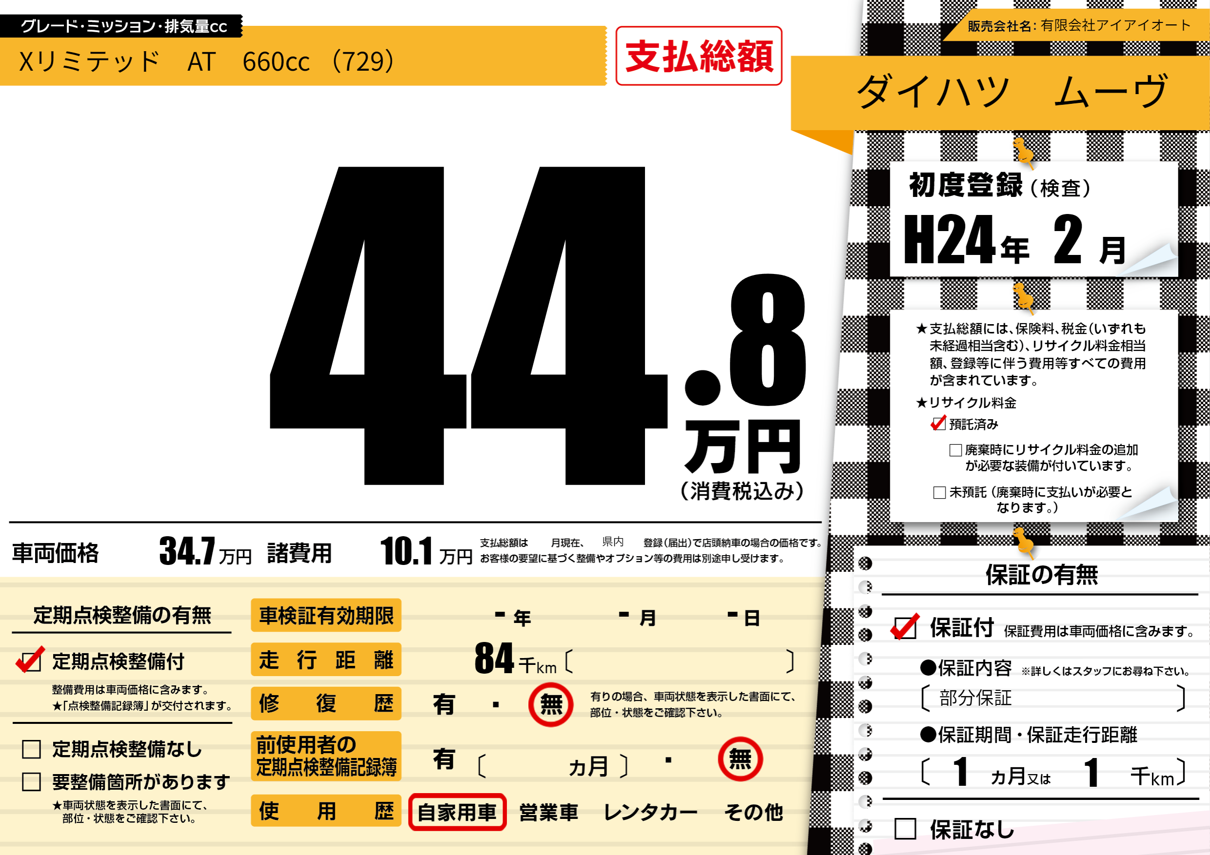 | 車名 | ダイハツ ムーヴ | グレード ミッション 排気量 |