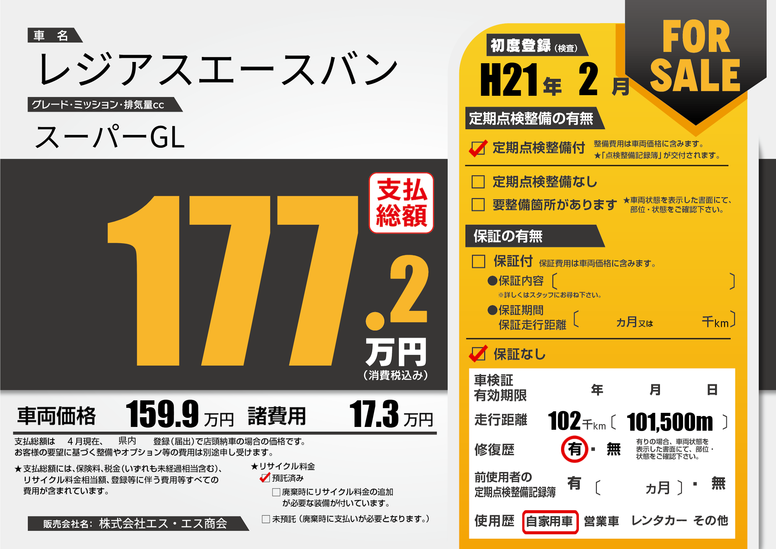 | 走行キロ | 10.2万km | 初年度登録 | H21年2月 |