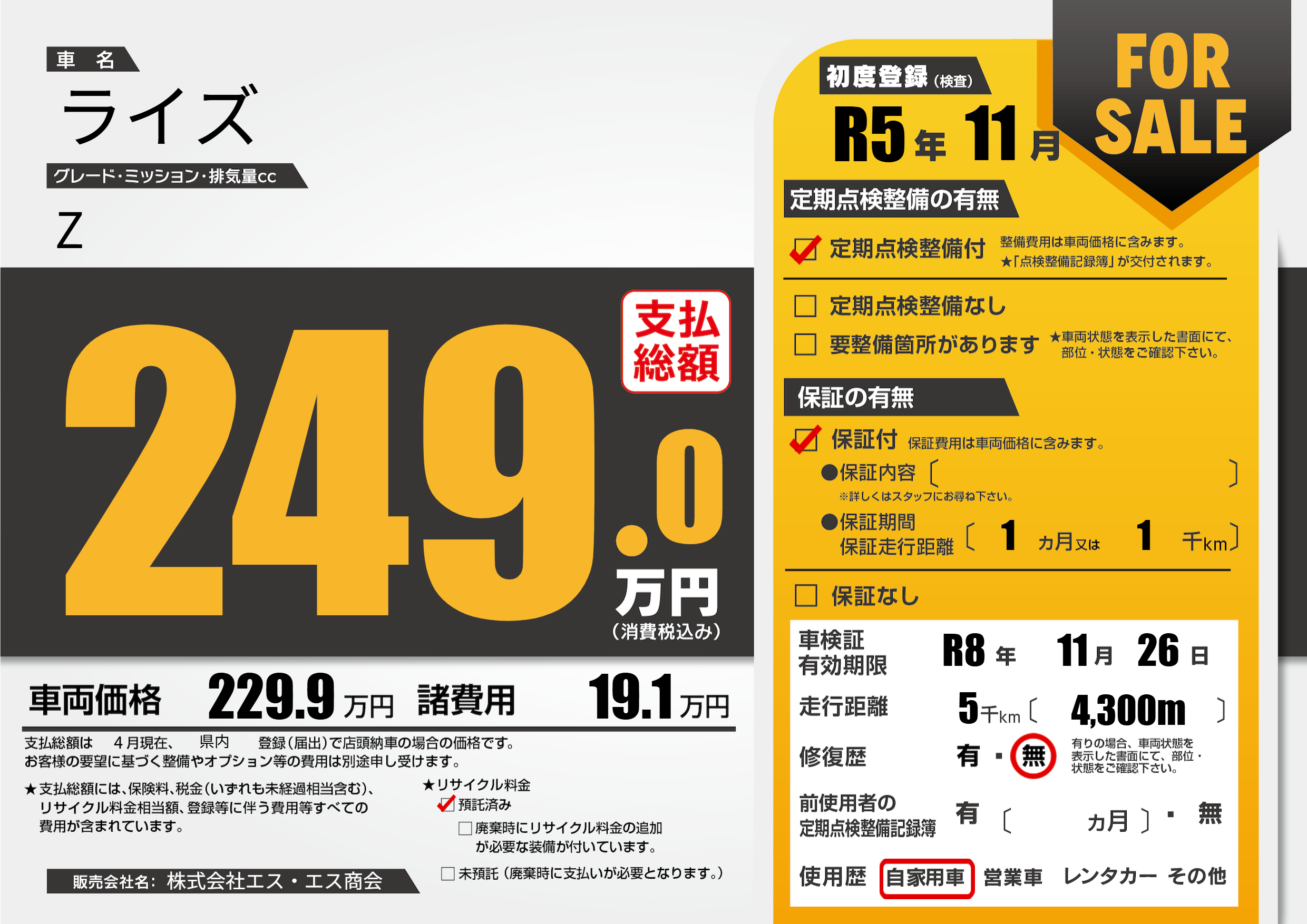 | 走行キロ | 0.5万km | 初年度登録 | R5年11月 |