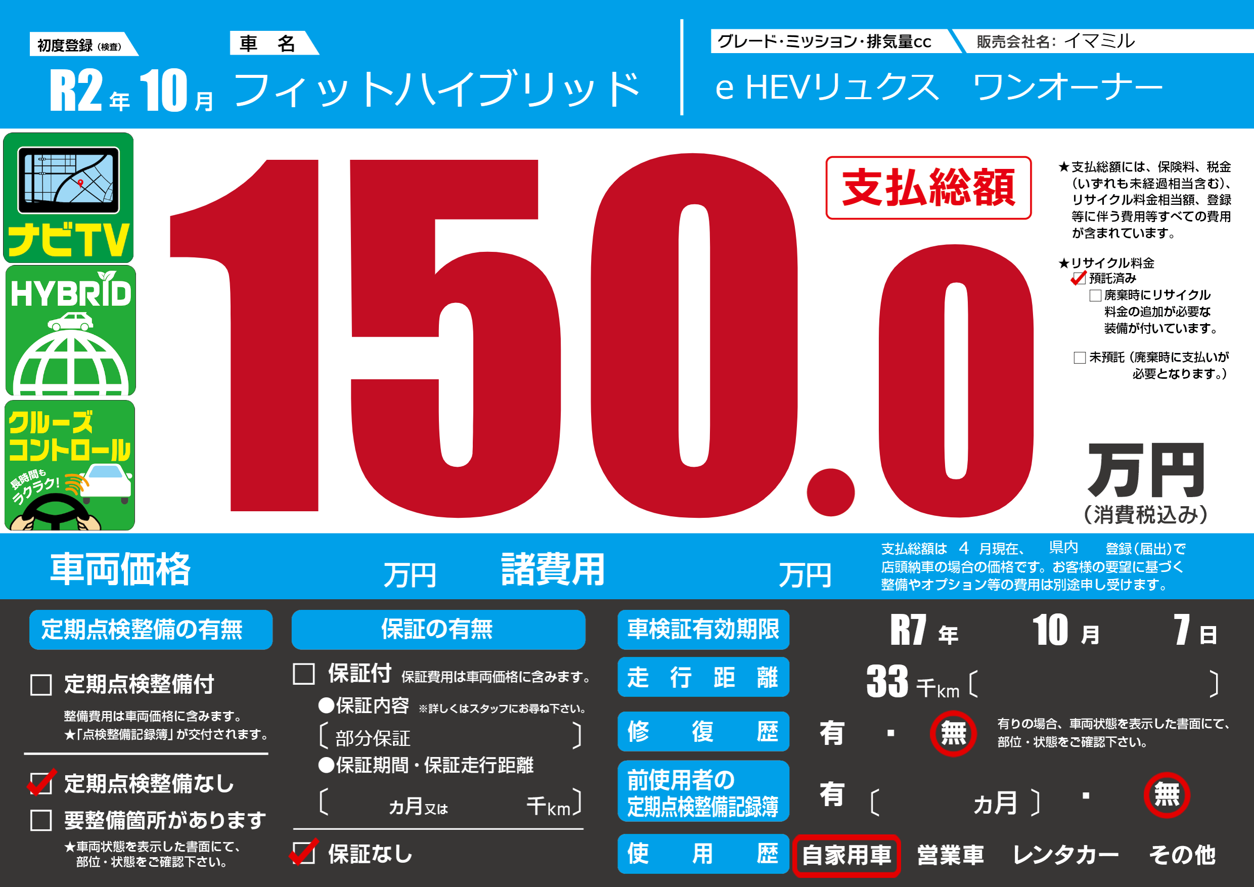 | 走行キロ | 3.3万km | 初年度登録 | R2年10月 |