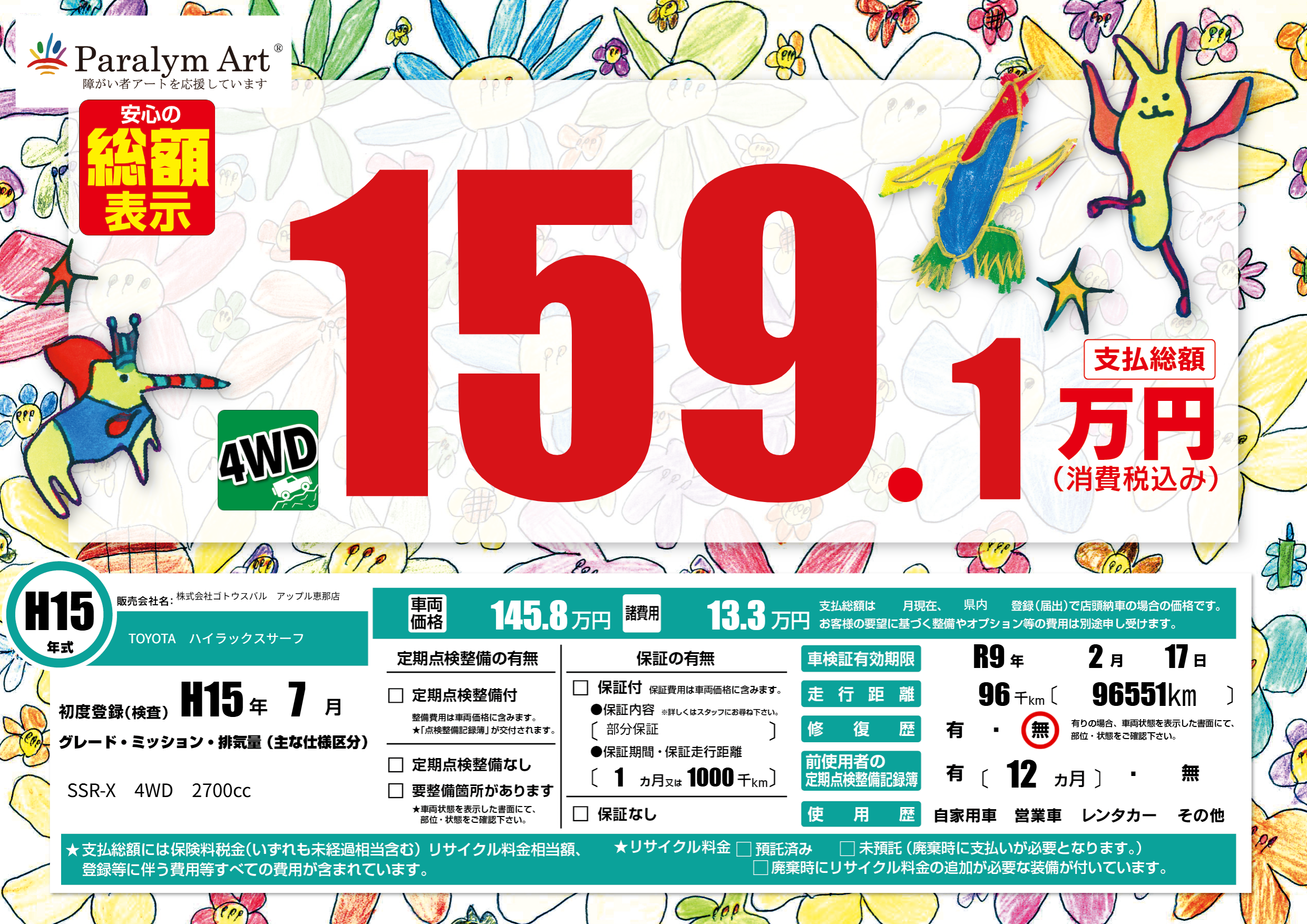 | 走行キロ | 9.6万km | 初年度登録 | H15年7月 |