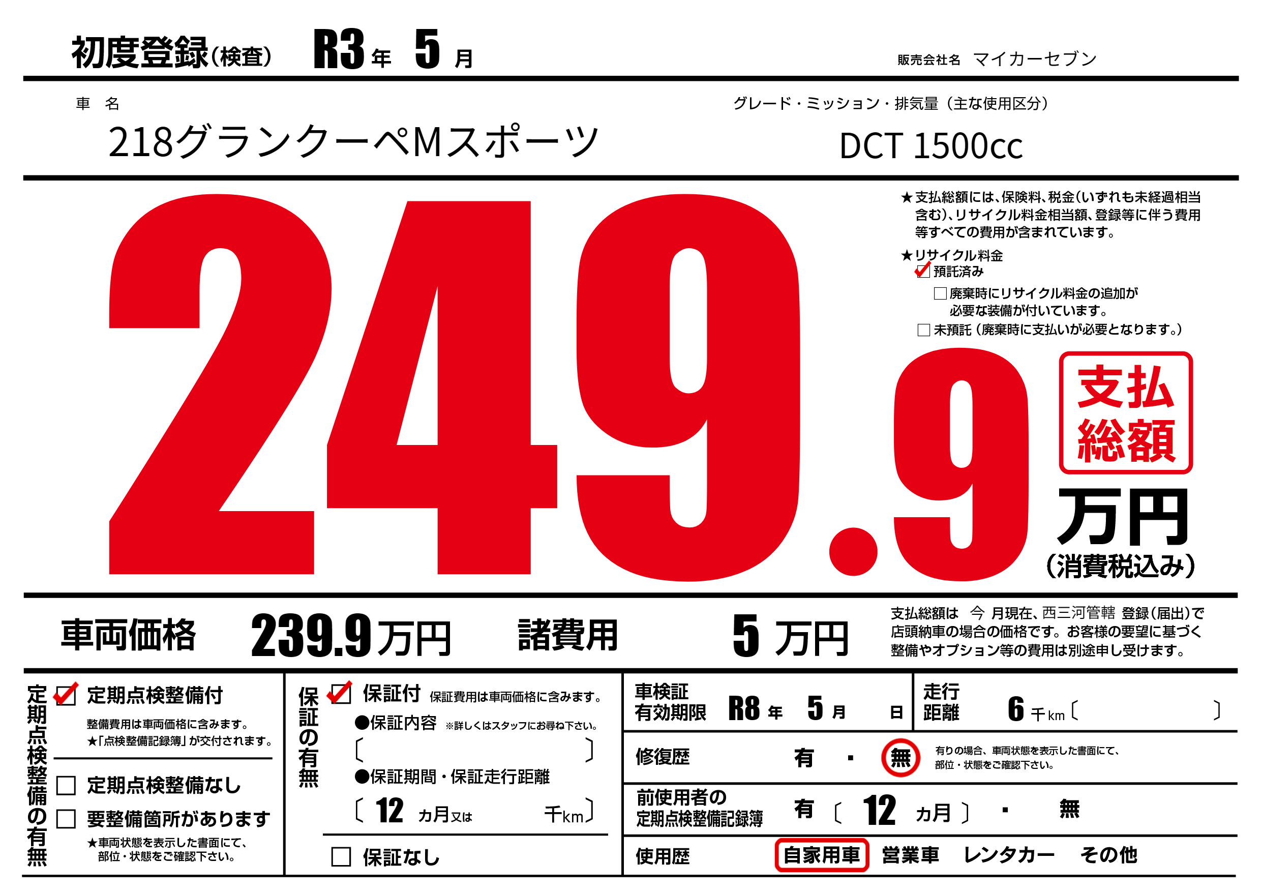 | 車名 | 218グランクーペMスポーツ | グレード ミッション 排気量 |