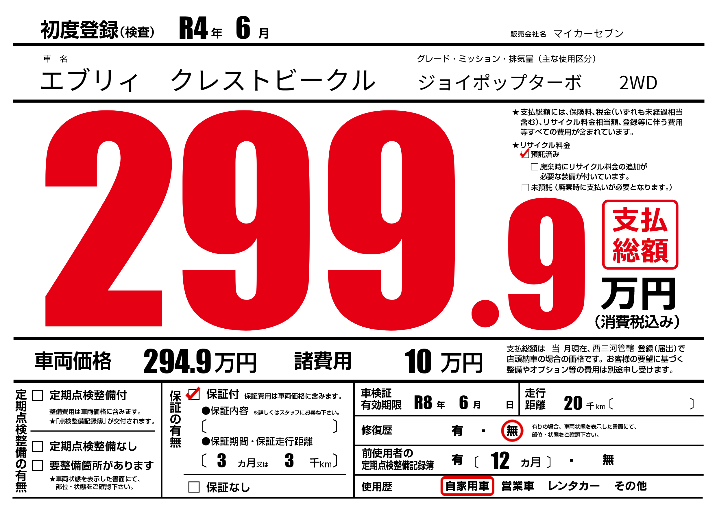 | 車名 | エブリィ クレストビークル | グレード ミッション 排気量 |