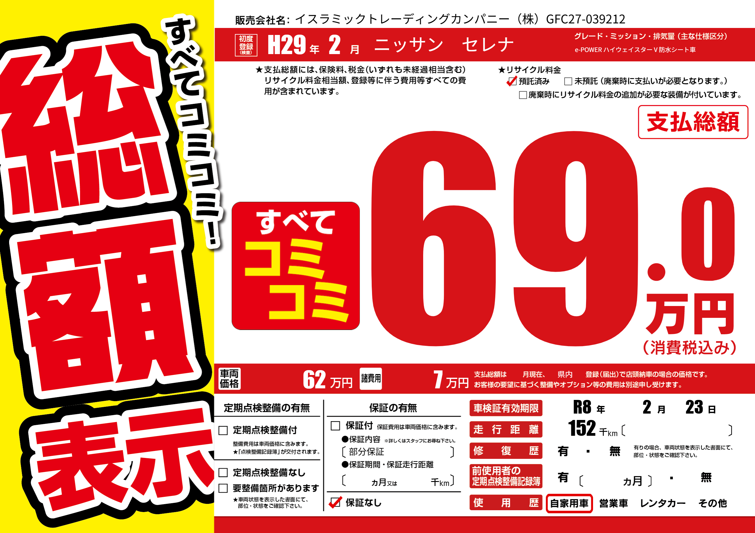 | 走行キロ | 15.2万km | 初年度登録 | H29年2月 |