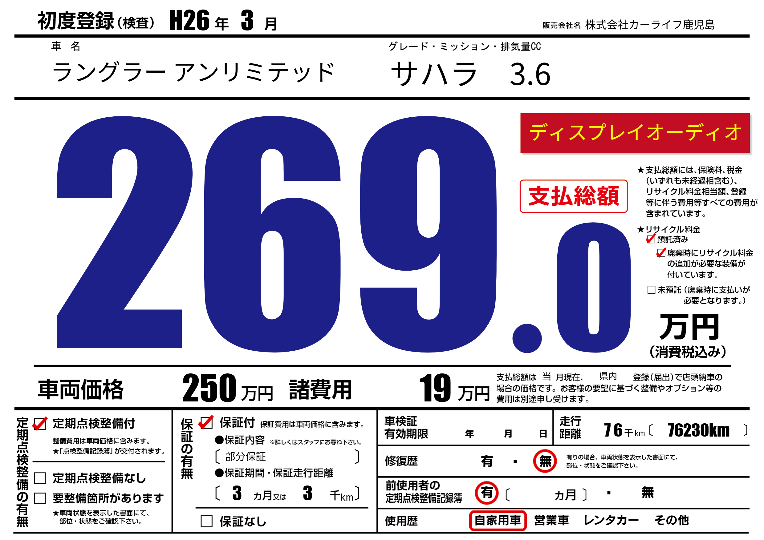| 車名 | ラングラー アンリミテッド | グレード ミッション 排気量 |