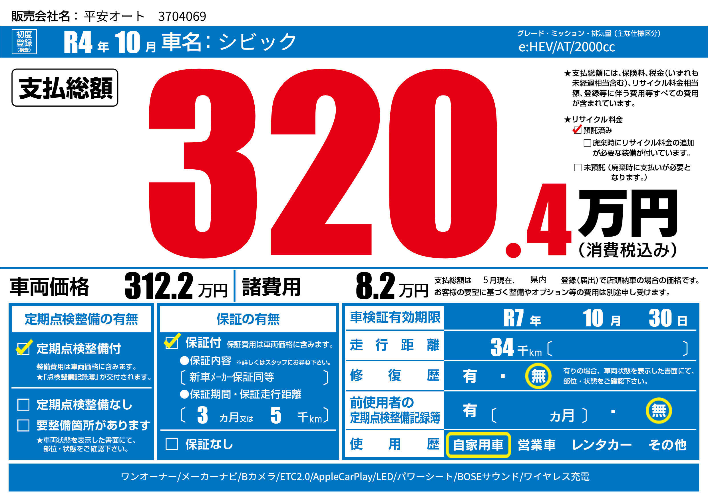 | 車検制限 | R7年 10月 30日 | ||