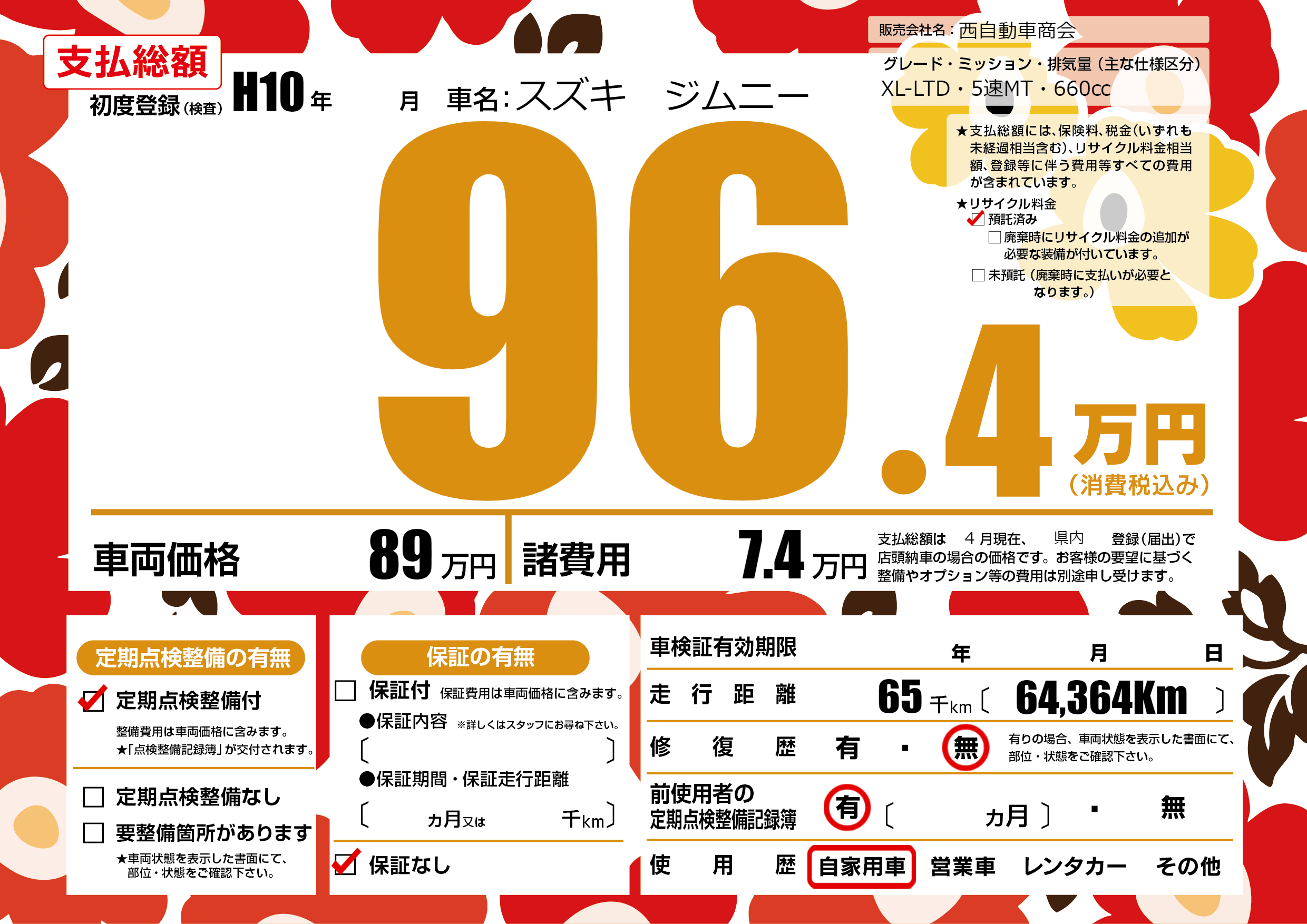 あり | リサイクル預託金相当額 | ( 0円)が別途必要 |