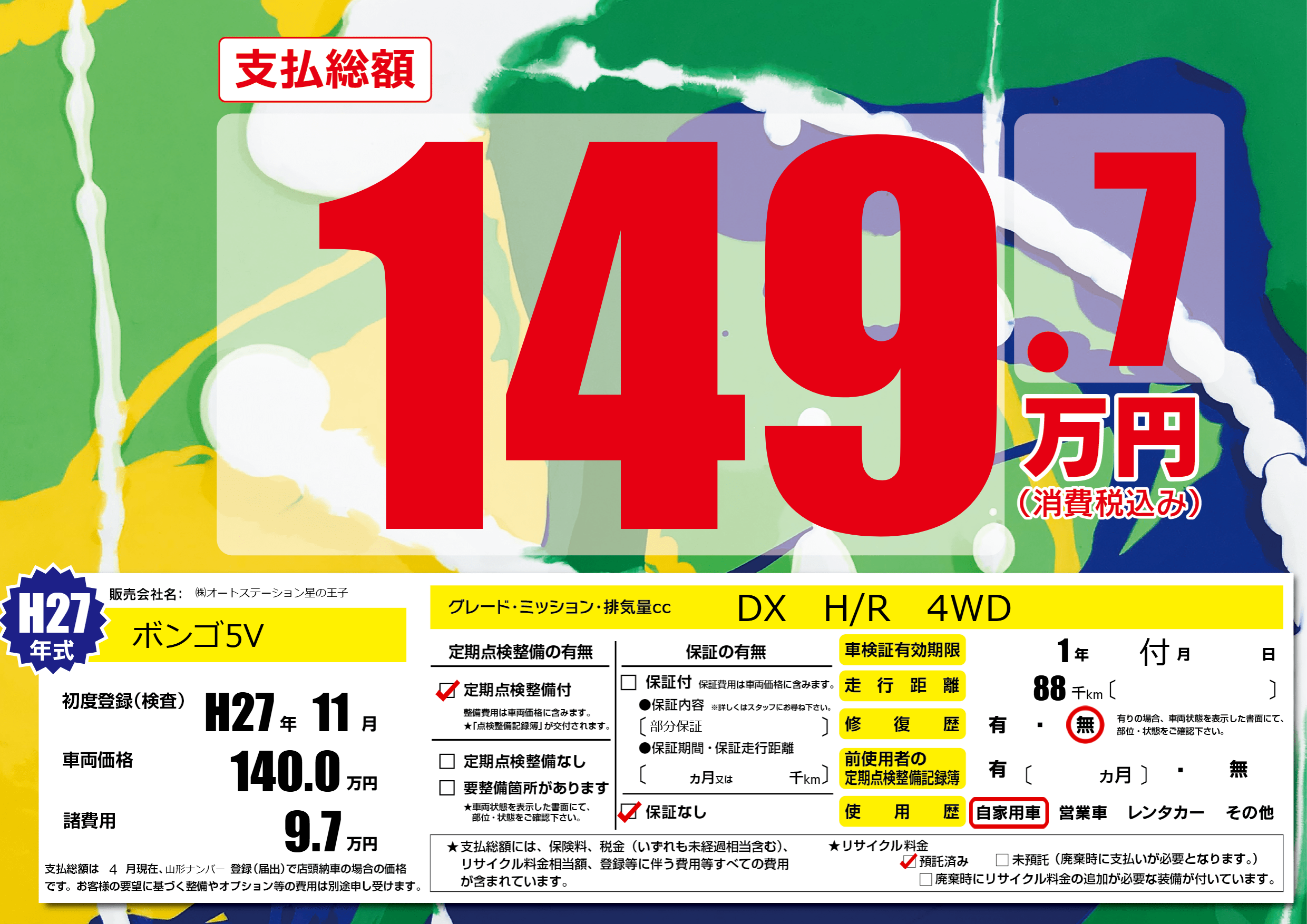 | 車名 | ボンゴ5V | グレード ミッション 排気量 |