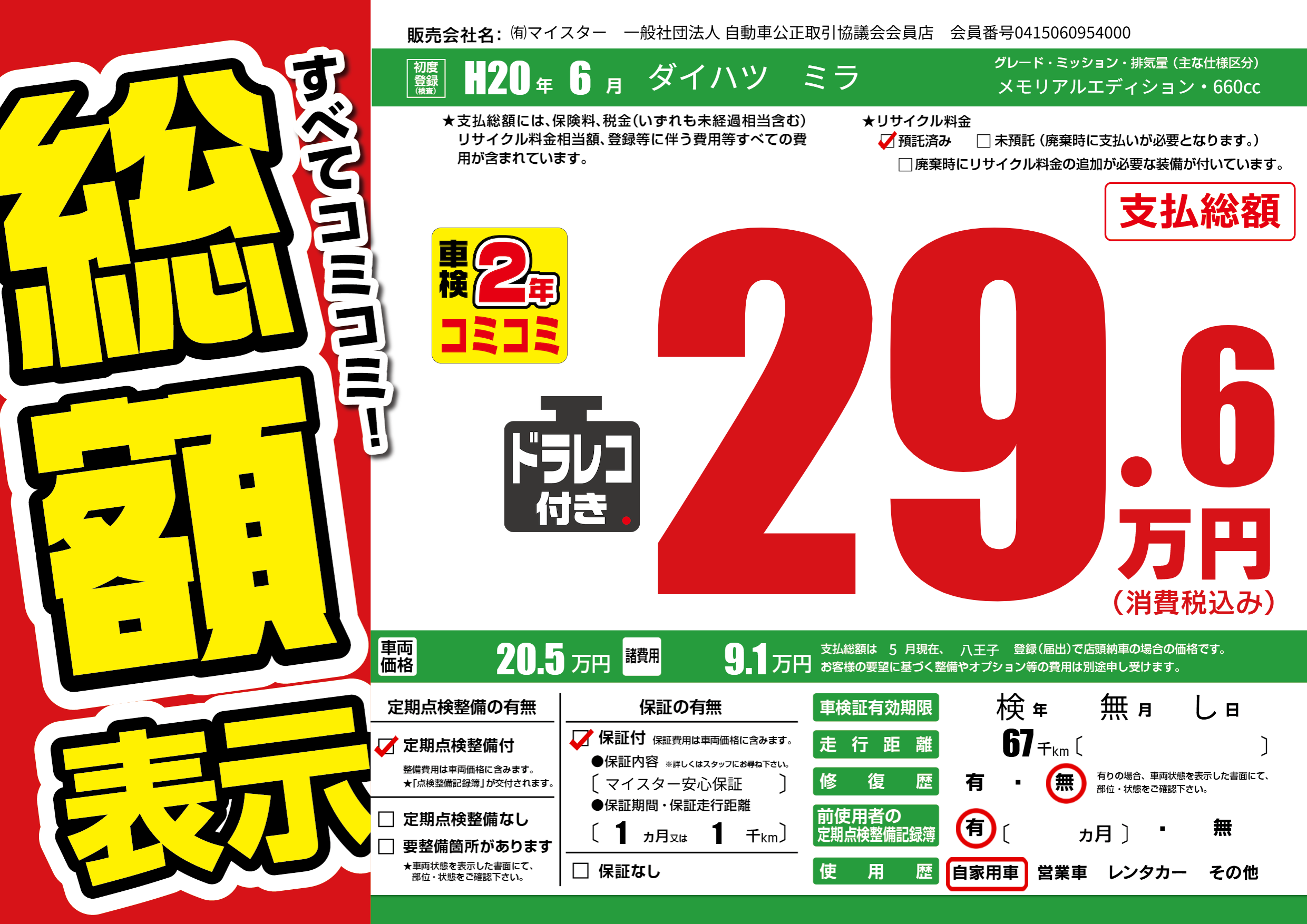 | 走行キロ | 6.7万km | 初年度登録 | H20年6月 |