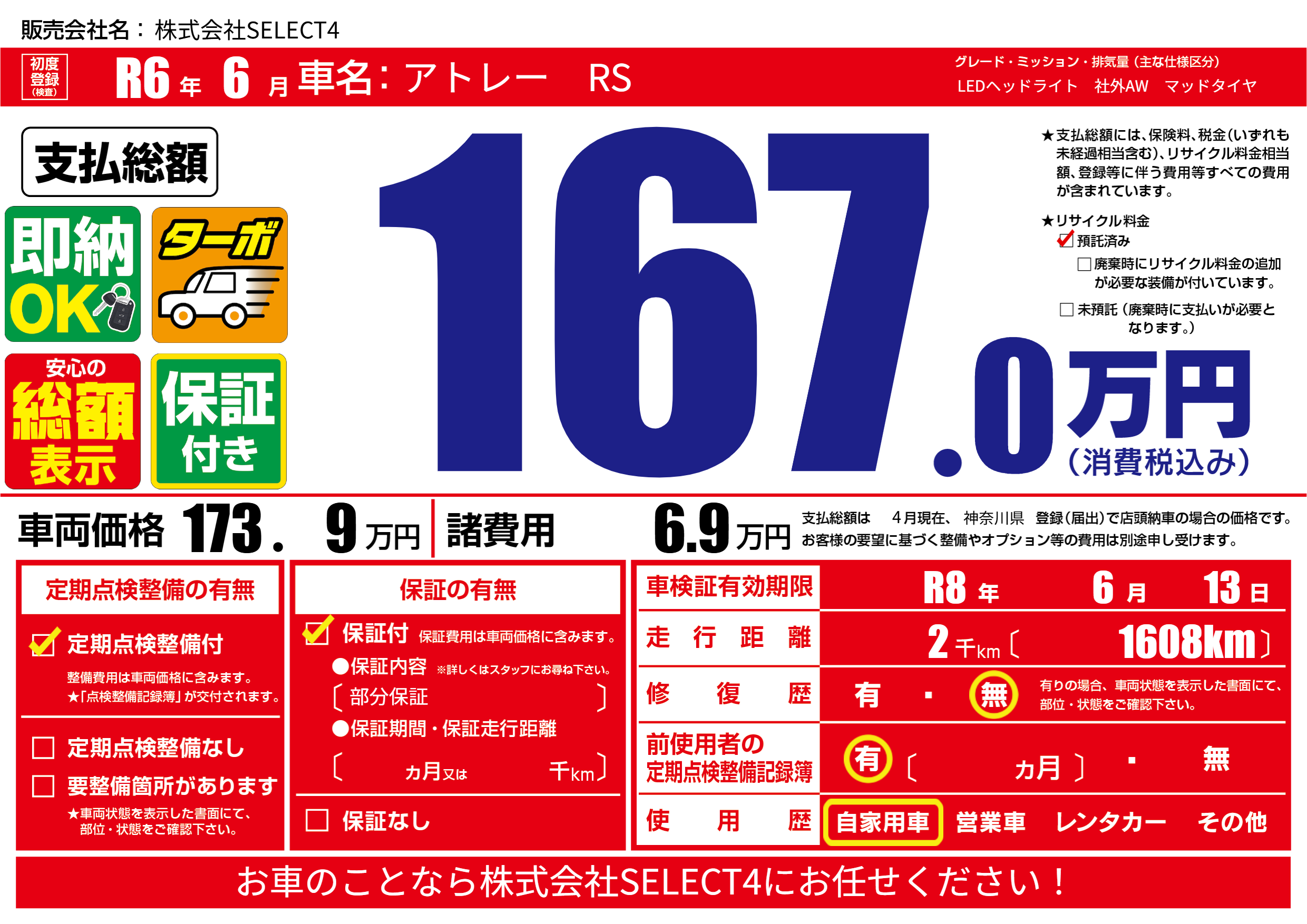 | 走行キロ | 0.2万km | 初年度登録 | R6年6月 |