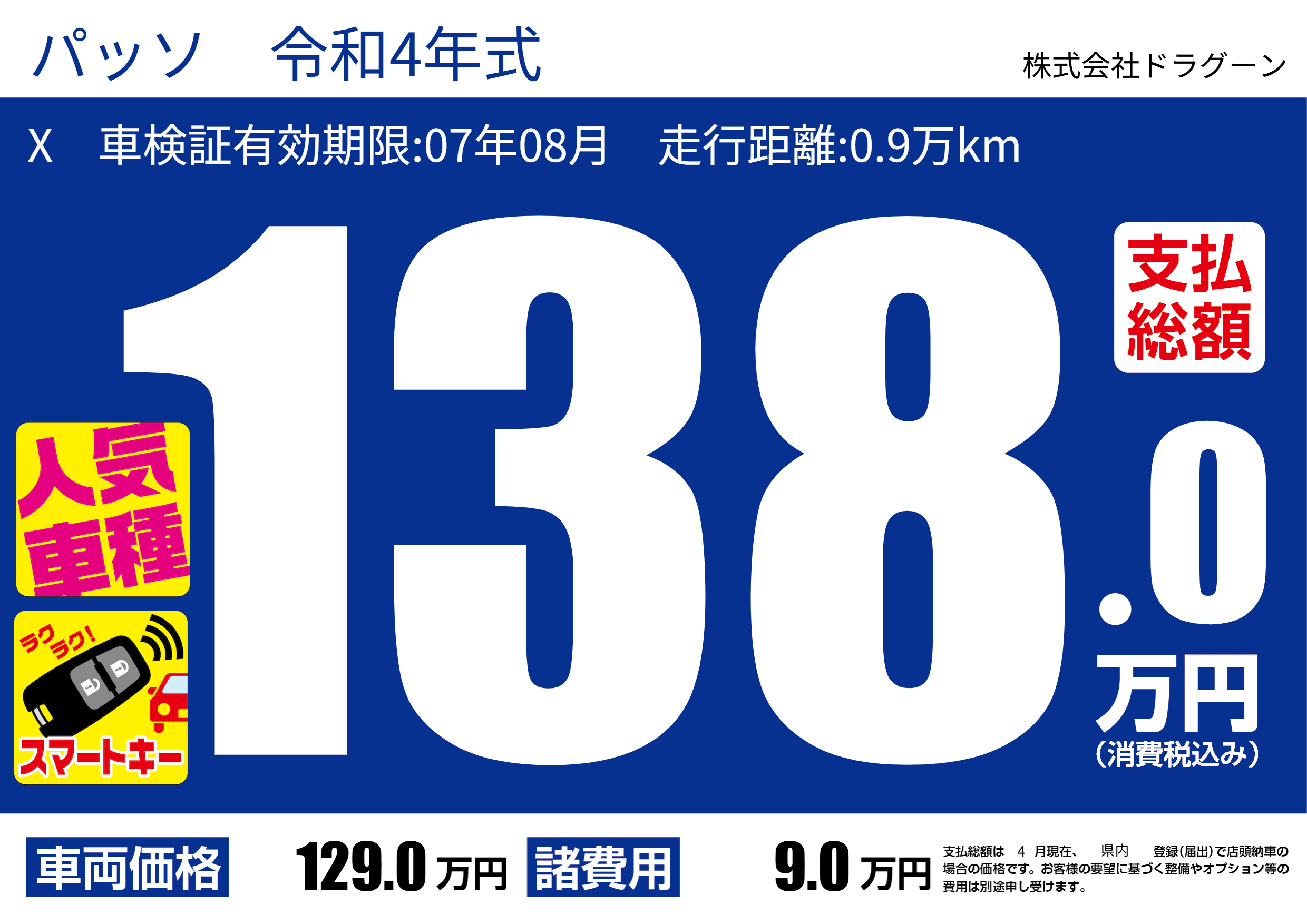 | 車名 | パッソ 令和4年式 | グレード ミッション 排気量 |
