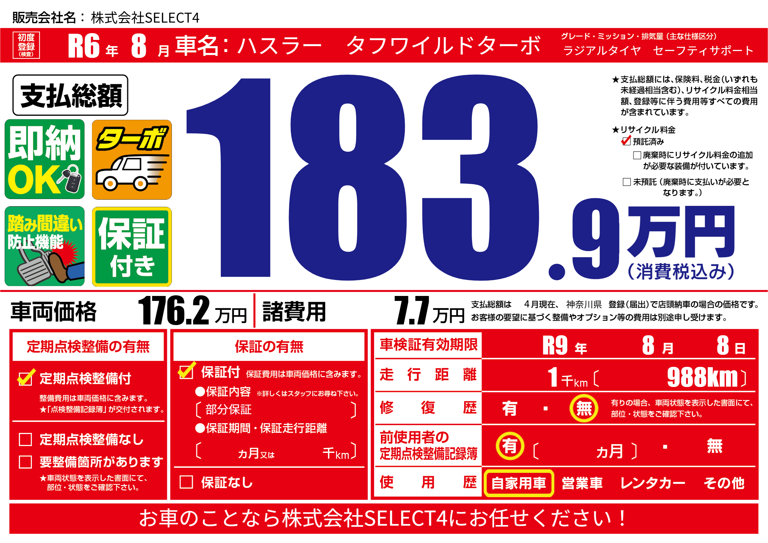 | 車名 | ハスラー タフワイルドターボ | グレード ミッション 排気量 |