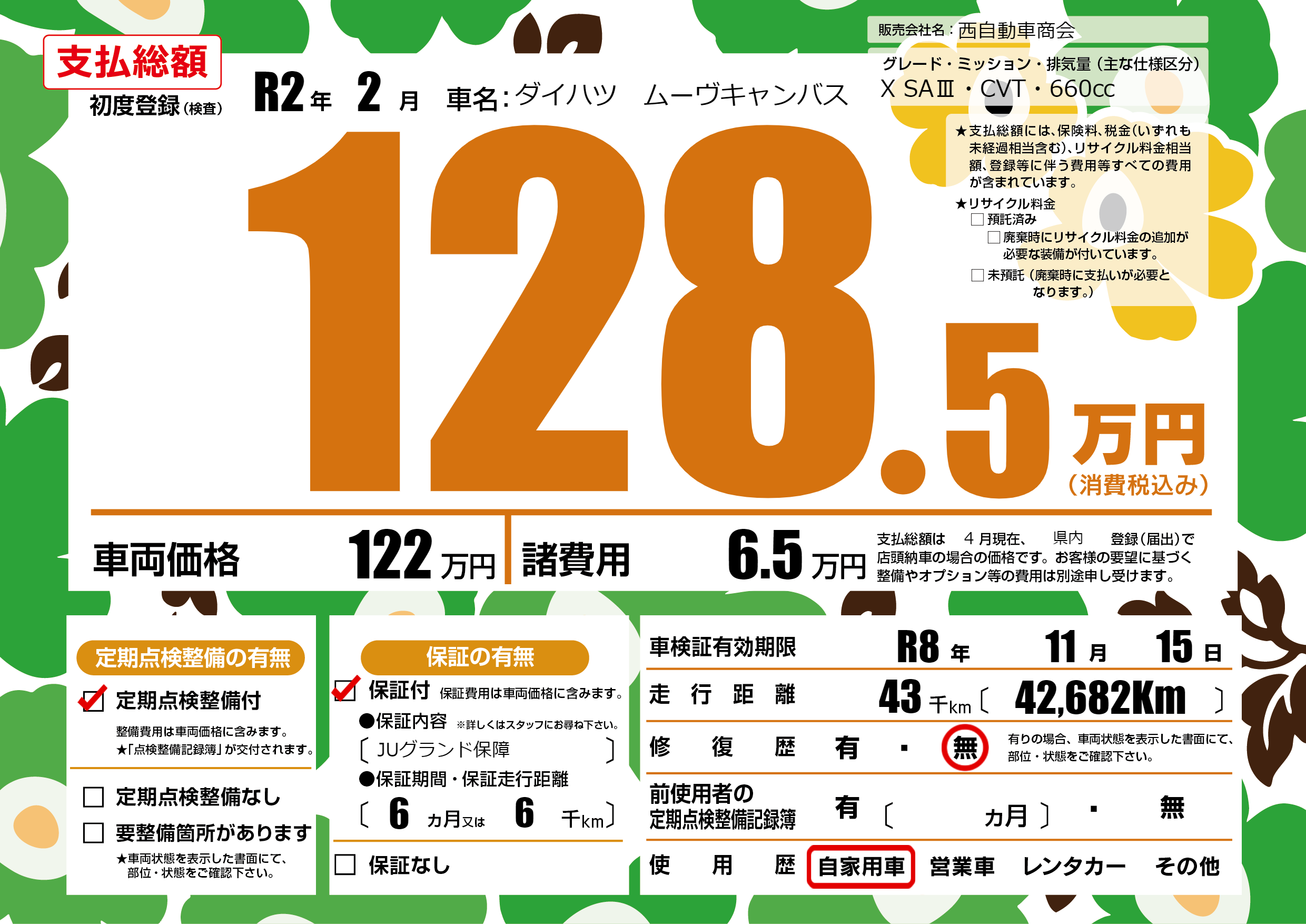 | 車名 | ダイハツ ムーヴキャンバス | グレード ミッション 排気量 |